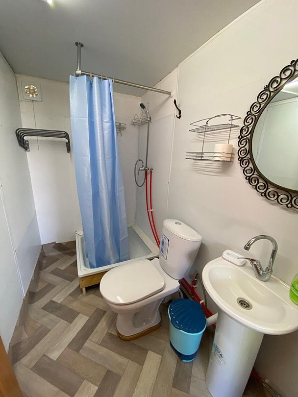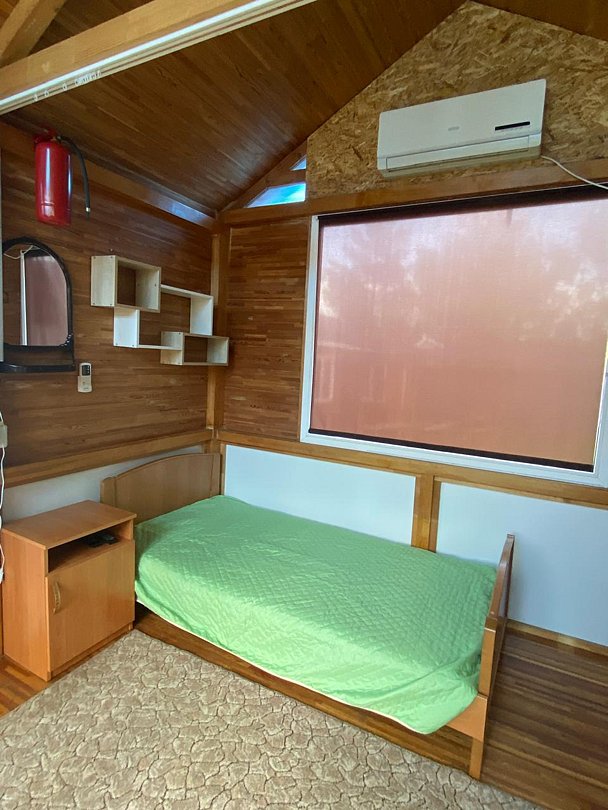Четырехместный дом с полным благоустройством: кондиционер, сан. узел(душевая кабина, унитаз, умывальник), кухня. ТВ(10 каналов). Просторная веранда для отдыха.