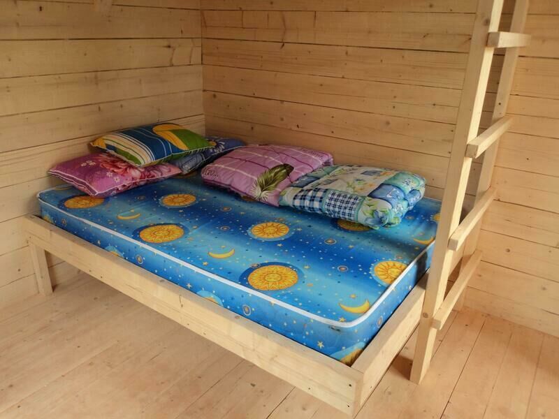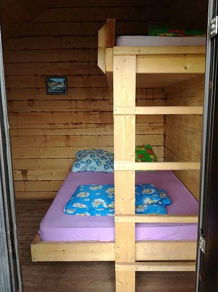 В доме 2 номера. Каждый номер рассчитан на 3-х человек на основном месте (деревянные кровати: одна двухспальная кровать, второй ярус односпальная), два дополнительных места (предоставляется двухспальный матрас на доп. место).