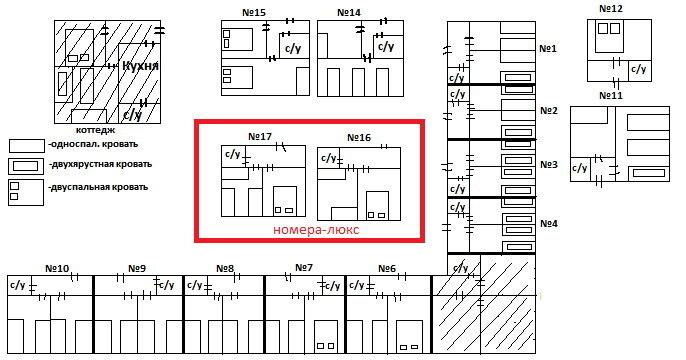 Номера люкс распологаются в блоках. Каждый блок состоит из 2-х комнат с ощей прихожей и санузлом.