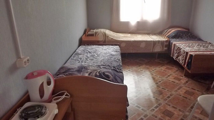 В номере из мебели три односпальные кровати, стол, стулья, три тумбочки. Санузел в номере унитаз, раковина с горячей и холодной водой. Так же в номере имеется плитка, чайник, минимальный набор посуды для приема пищи.