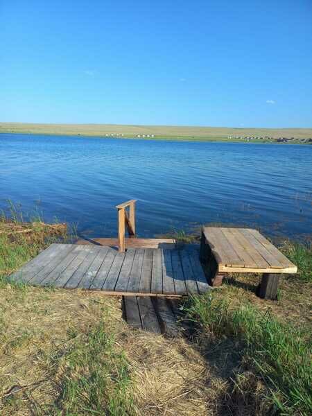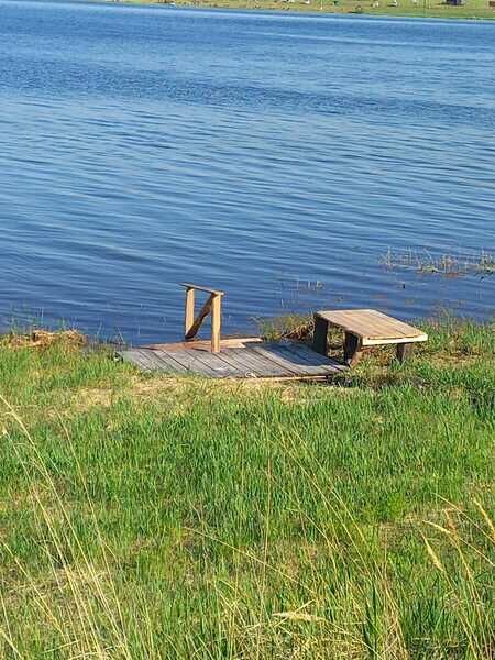 Вход в воду обустроен деревянным пирсом с перильцами.