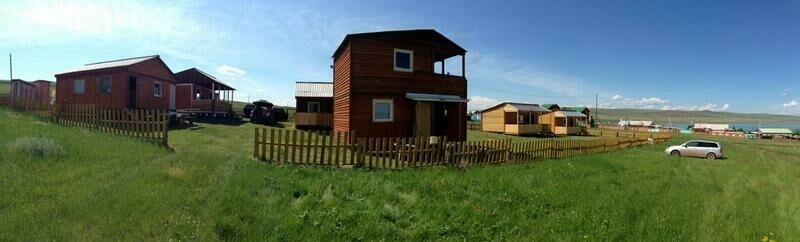 Это небольшой домик с террасой, с которой открывается замечательный вид на озеро. Удобства находятся на улице. Дом состоит из одной секции. В домике две двуспальные кровати, две односпальные, полностью оборудованная кухонная зона (чайник, холодильник, газовая плита, кастрюля, сковорода, минимальный набор пластиковой посуды). Санузел на улице.