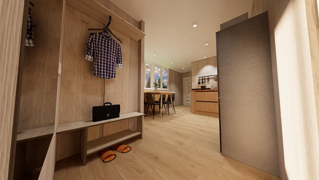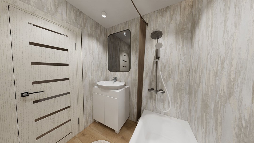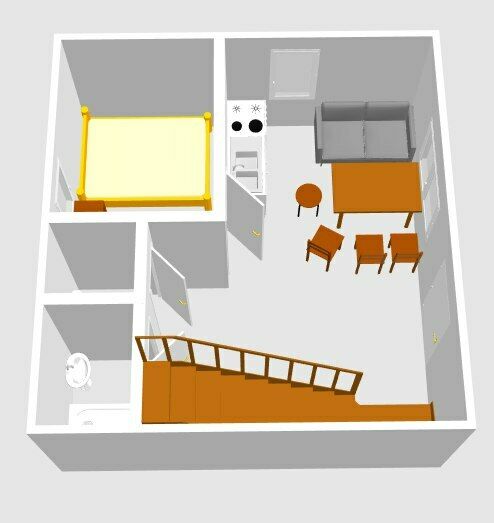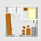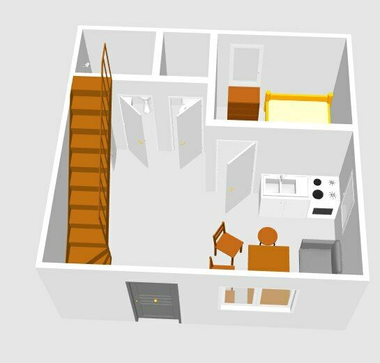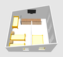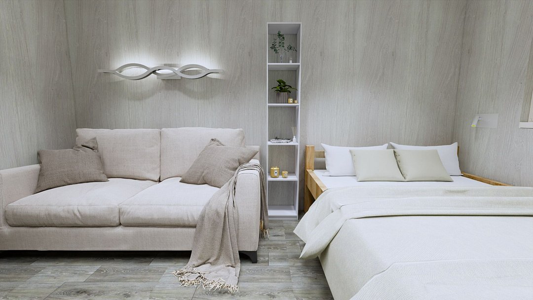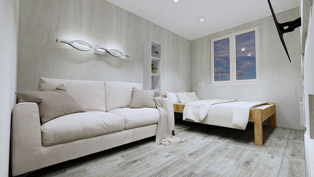 Площадь: 14 м2 — спальня, с/узел; 11 м2 — кухонная зона.