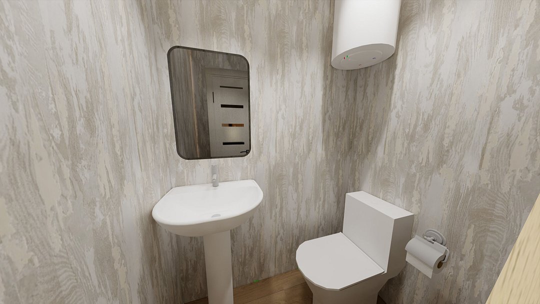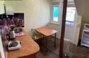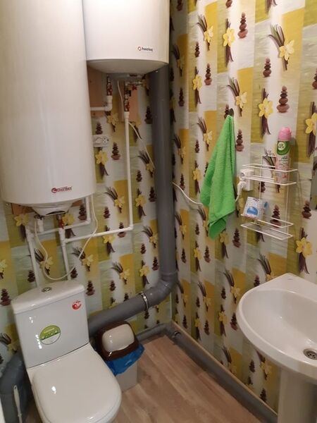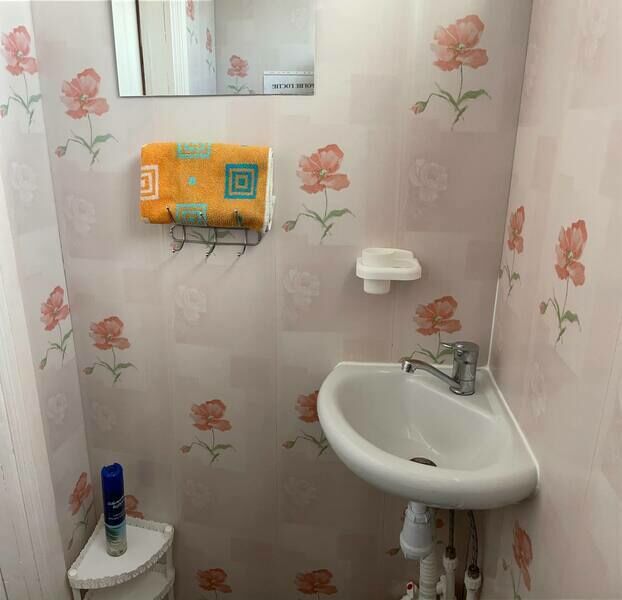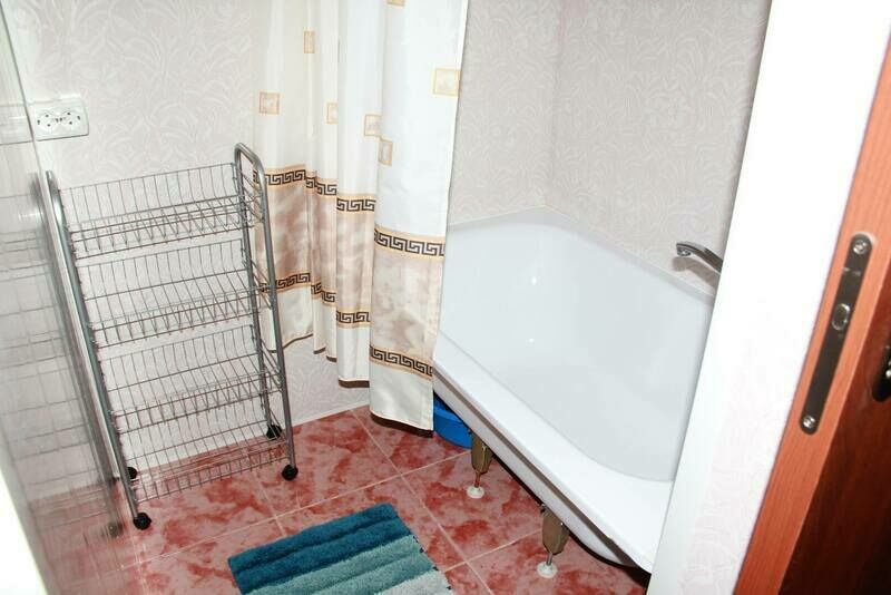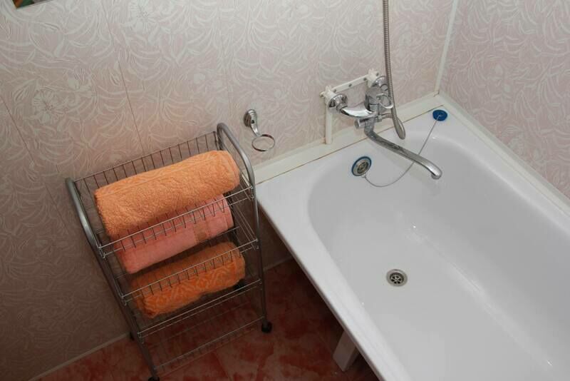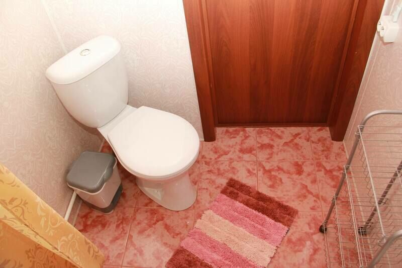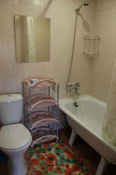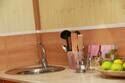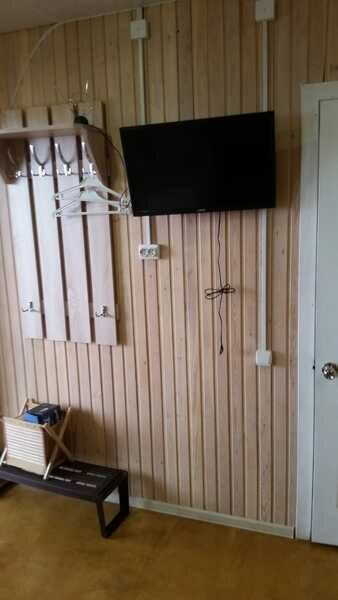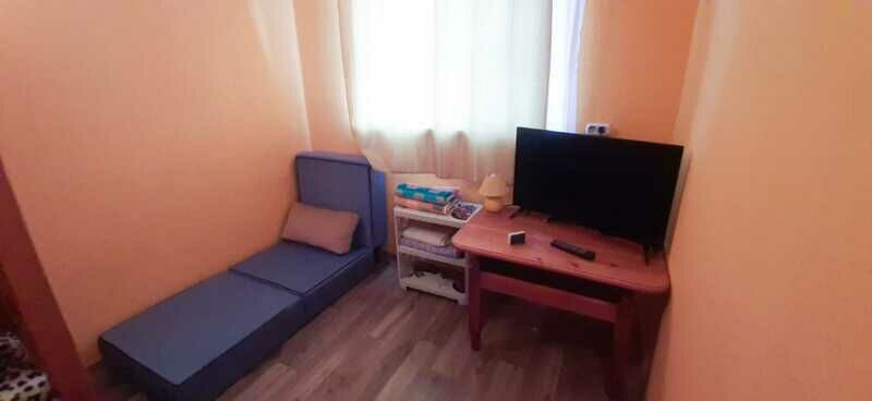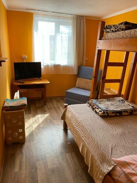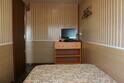 В спальне — добротная двухъярусная кровать (внизу 2 места, вверху одно), модульное кресло, столик, стулья, тумбочка, полки для одежды, телевизор. На кухне — гарнитур, холодильник, плита, СВЧ, посуда для приготовления и сервировки, кухонная утварь. Ванна и туалет совмещены, вход из спальни.