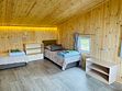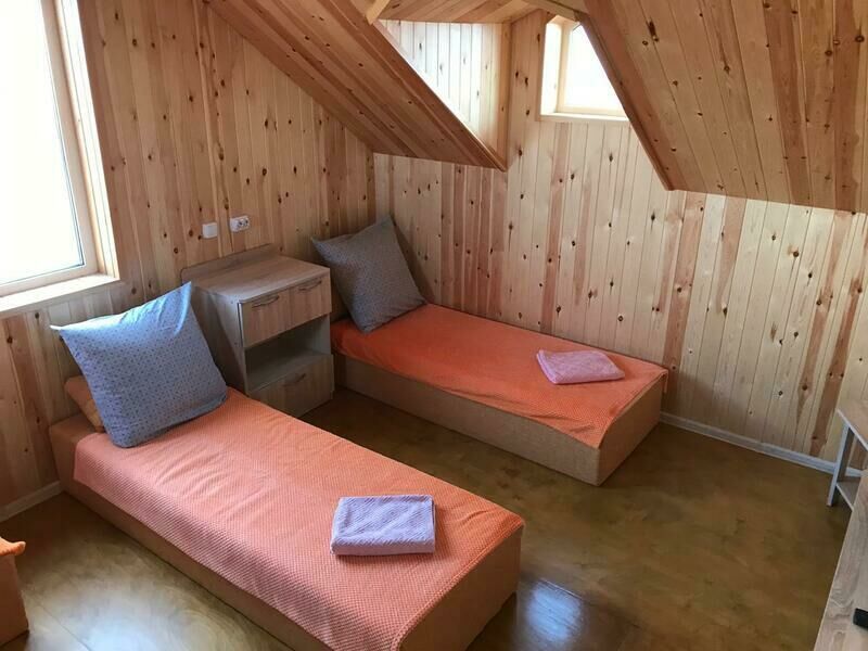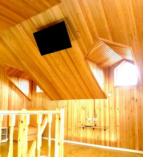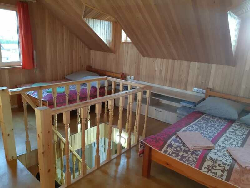 Второй уровень (мансардный этаж) — две односпальные кровати с мягкими изголовьями (комфортно сдвигаются в одну), раскладное модульное кресло, комод, тумбочка, телевизор. Вид с мансарды на озеро, горы, Храм.