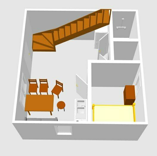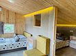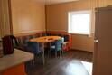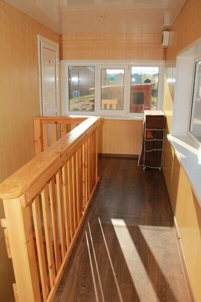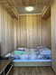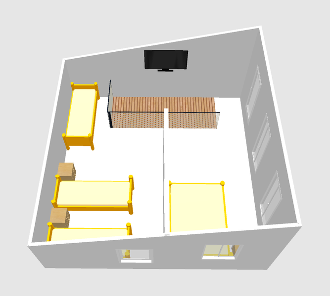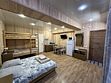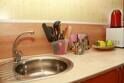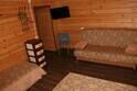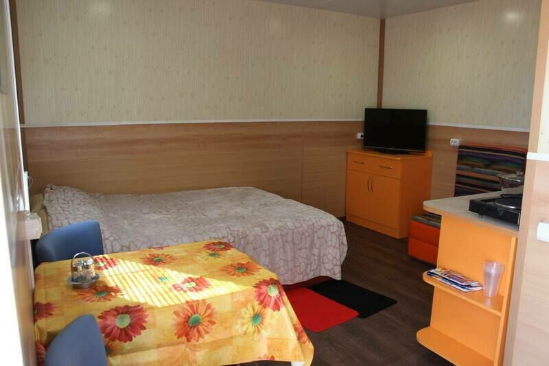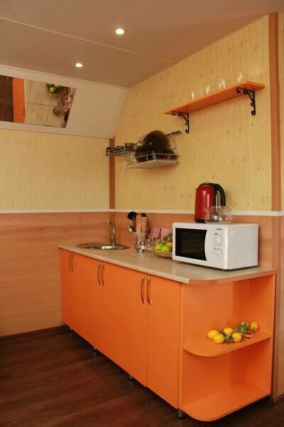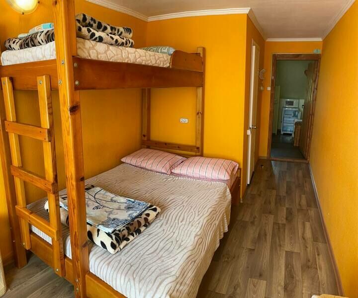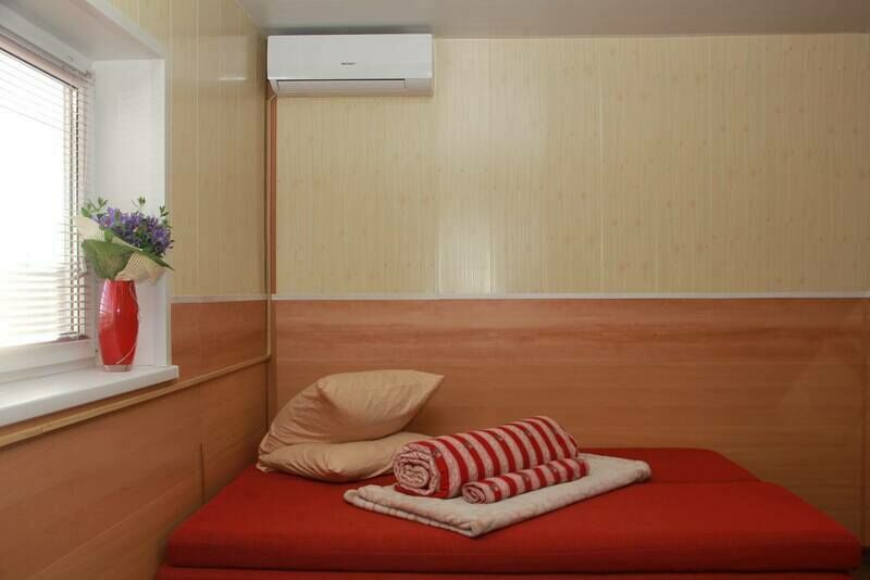 В спальне — две односпальные кровати и одна двухъярусная (полноценные спальные места), столик, стулья, тумбочки, полки для одежды, телевизор. Односпальные кровати комфортно соединяются в одну двуспальную. На кухне — гарнитур, холодильник, плита, СВЧ, посуда для приготовления и сервировки, кухонная утварь. Душ и туалет раздельные, в туалете есть раковина, входы их кухонной зоны.