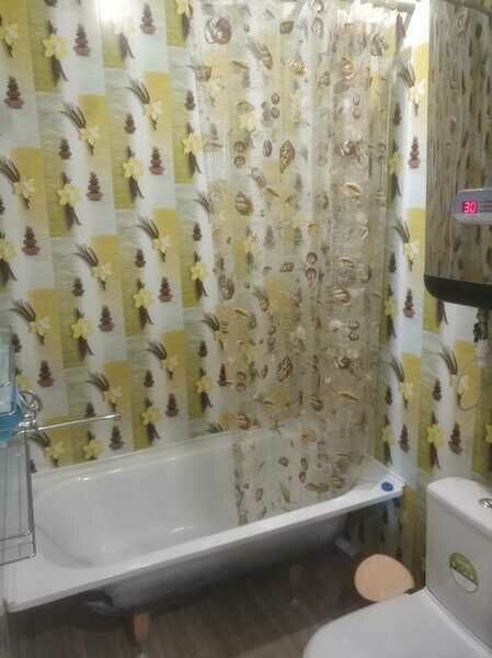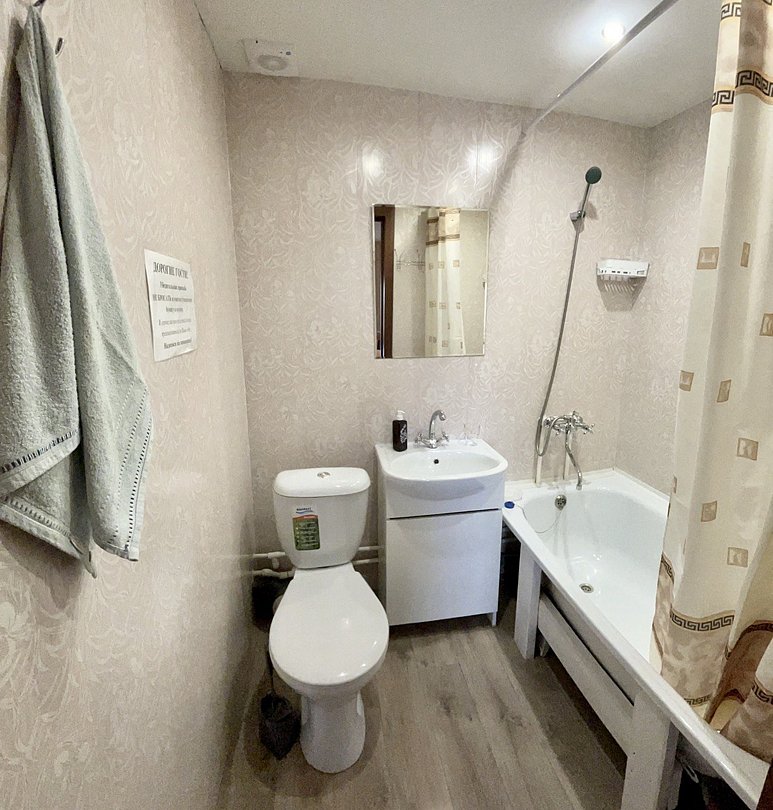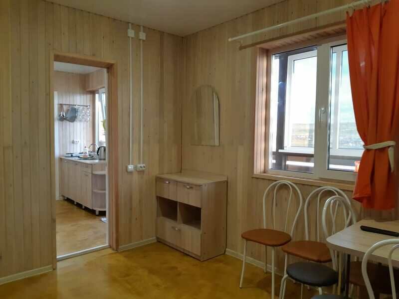 В комнате — две односпальные кровати с мягкими изголовьем (комфортно сдвигаются в одну), комод, тумбочка, обувница, телевизор, обеденная зона, кухонный гарнитур, холодильник, плита, СВЧ, посуда для приготовления и сервировки, кухонная утварь. Вид на парковку в сторону озера. Ванная и туалет раздельные, есть раковина.