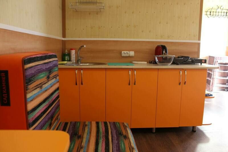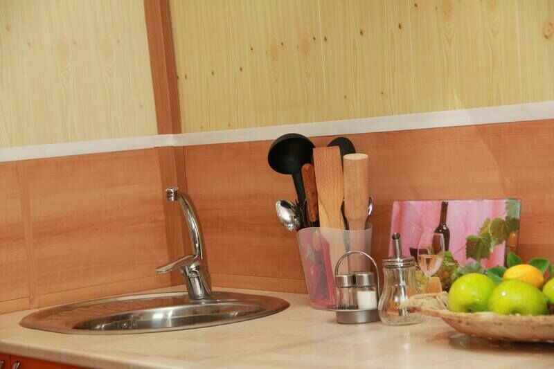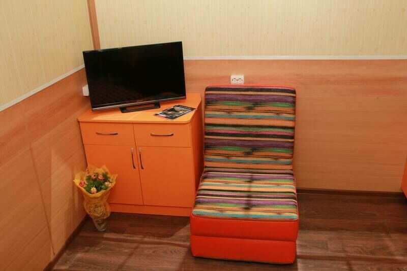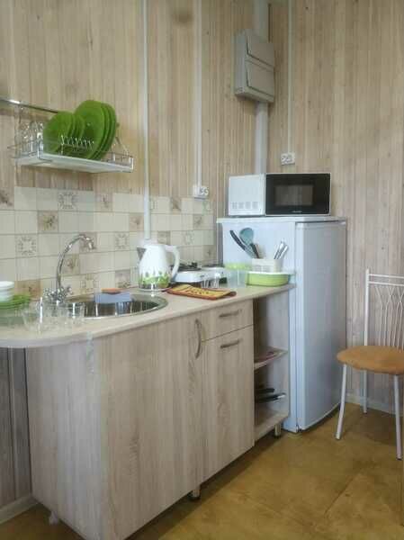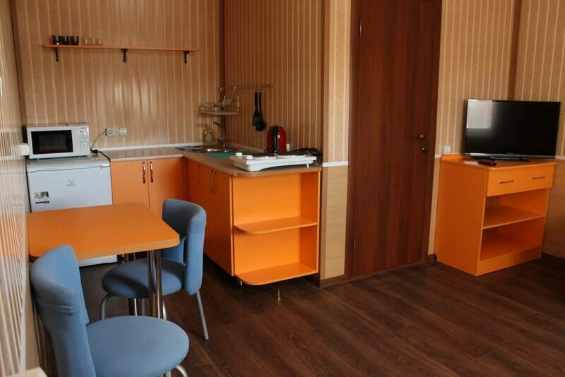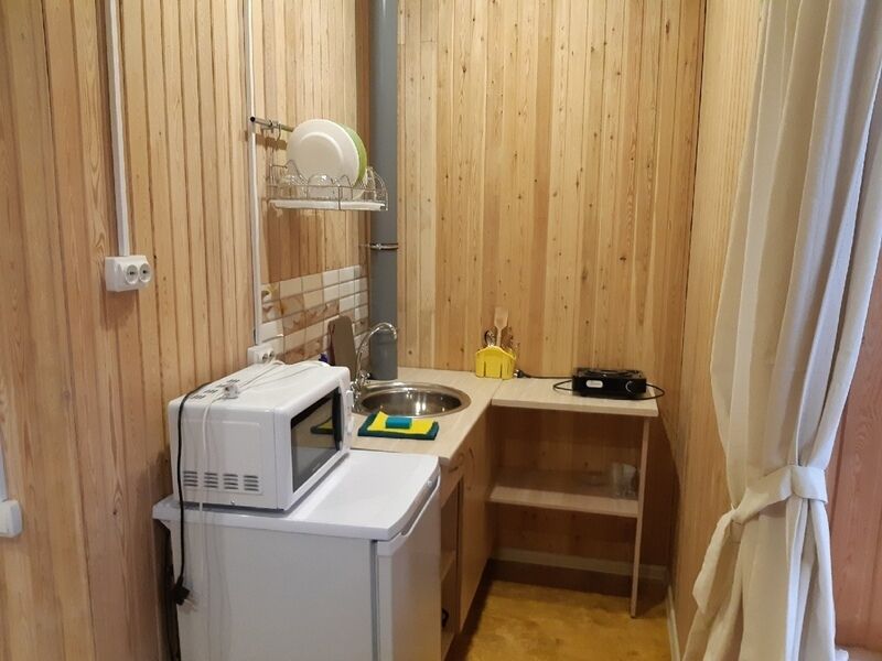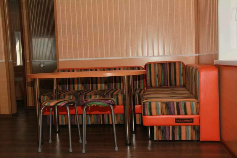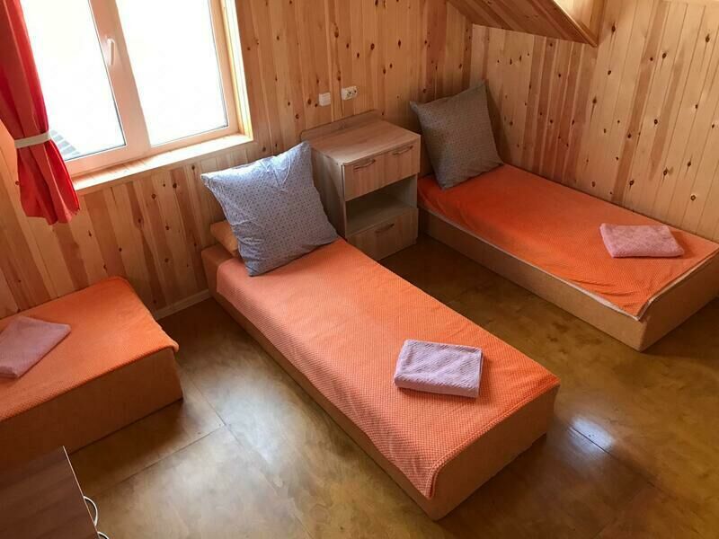 В номерах на 2-3 человека — две односпальных кровати (комфортно сдвигаются в одну) и раскладное кресло. В номерах на 3-4 человека — двуспальная кровать и добротная двухъярусная. Комоды из натурального дерева, тумбочки, обувницы, телевизор, обеденная зона, кухонный гарнитур, холодильник, плита, СВЧ, посуда для приготовления и сервировки, кухонная утварь.