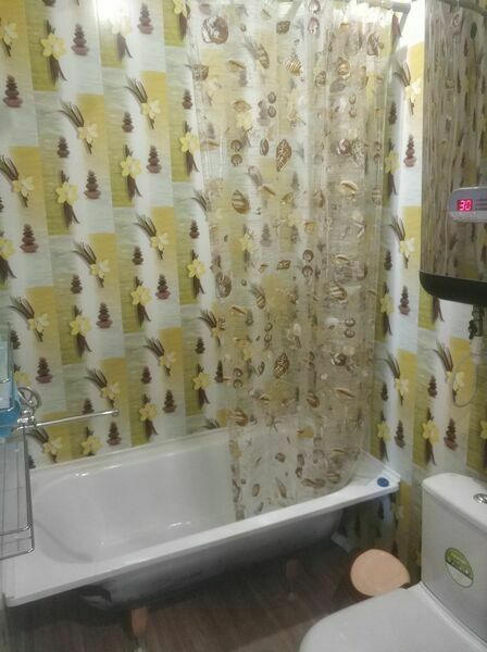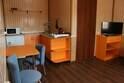 Студия оборудована кондиционером. В комнате: две односпальных кровати с мягкими изголовьями (комфортно сдвигаются в одну), комод, обувница, телевизор, обеденная зона, кухонный гарнитур, холодильник, плита, СВЧ, посуда для приготовления и сервировки, кухонная утварь. Ванная и туалет совмещены, есть раковина.