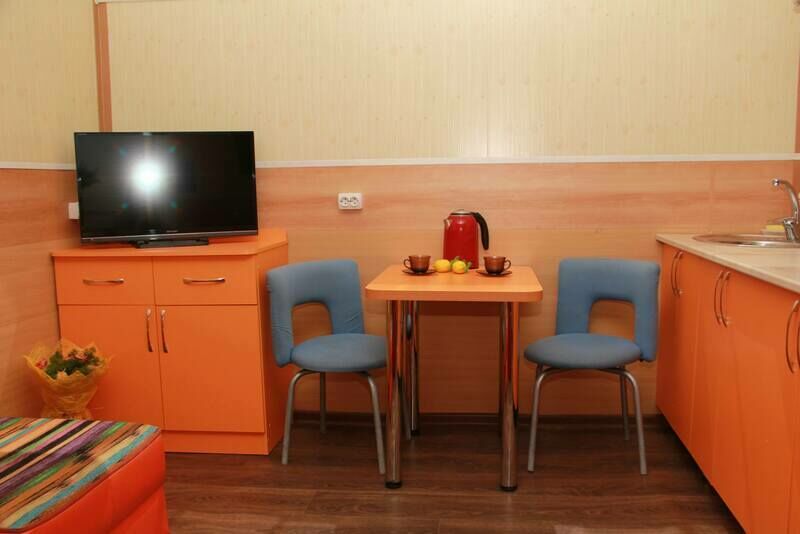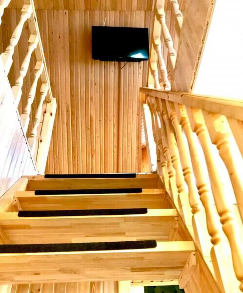 Двухуровневый номер повышенной комфортности с кондиционером, дизайнерской отделкой, подсветкой лестницы и стен. Первый уровень — кухонный гарнитур, холодильник, плита, СВЧ, посуда для приготовления и сервировки, кухонная утварь, обеденная зона, ванна и туалет (совмещены), двуспальная кровать.