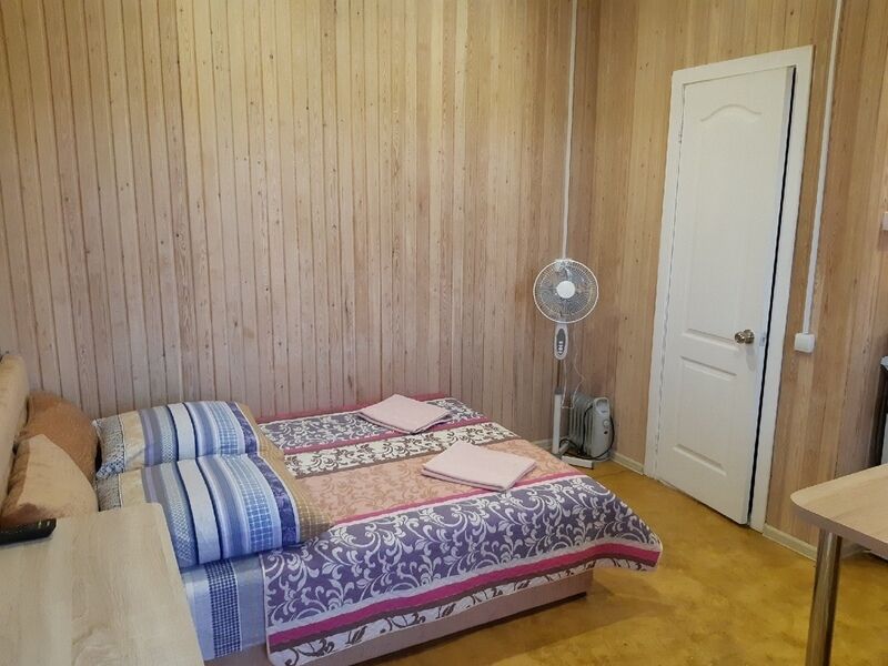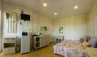 Студия оборудована кондиционером. В комнате — двуспальная кровать с мягкими изголовьем, тумбочка, обувница, телевизор, обеденная зона, кухонный гарнитур, холодильник, плита, СВЧ, посуда для приготовления и сервировки, кухонная утварь. Вид на территорию. Ванная и туалет совмещены.