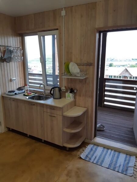 Вид на озеро, кафе, тарзанку, зону детской анимации, территорию, Храм, батут. Ванная и туалет совмещены.