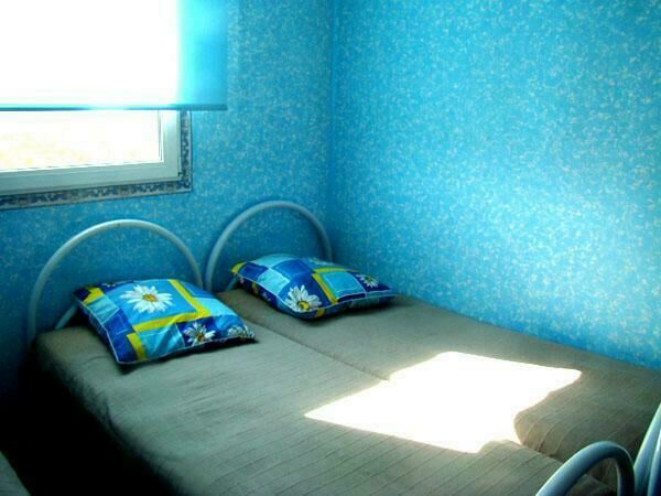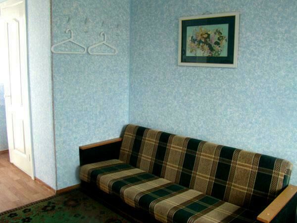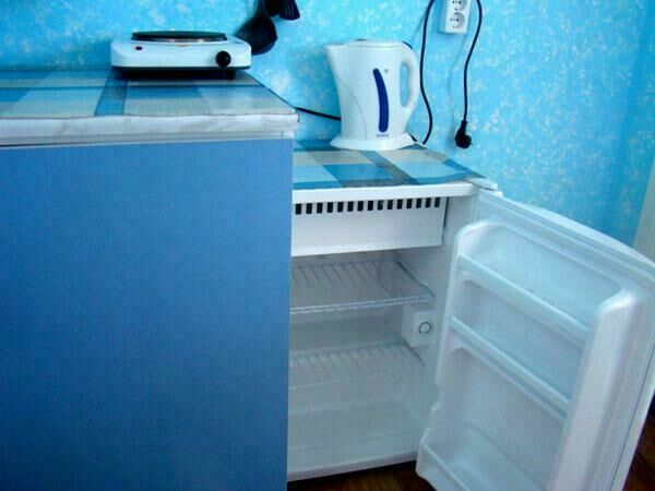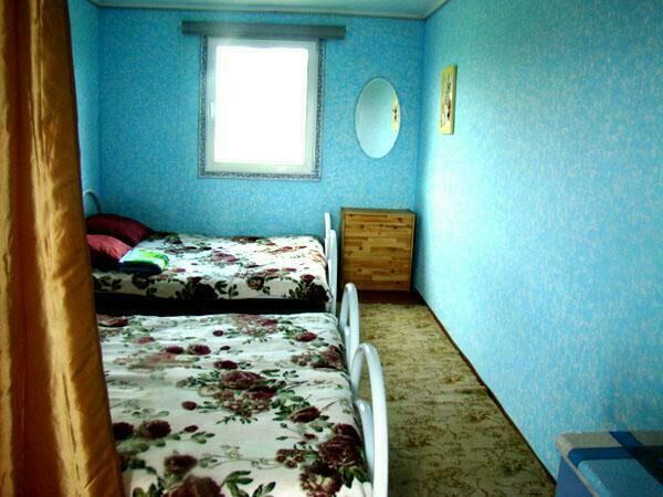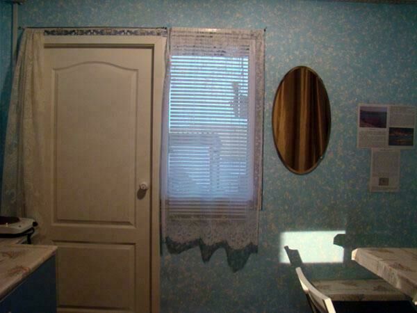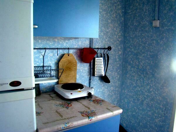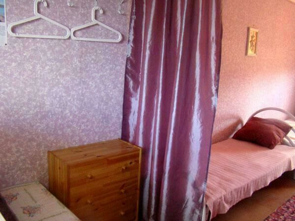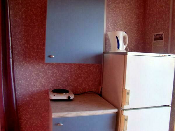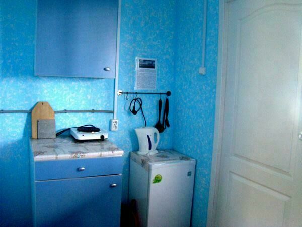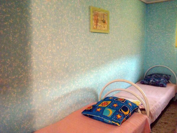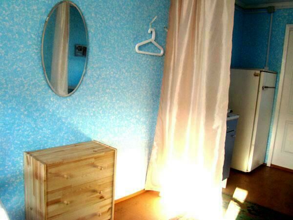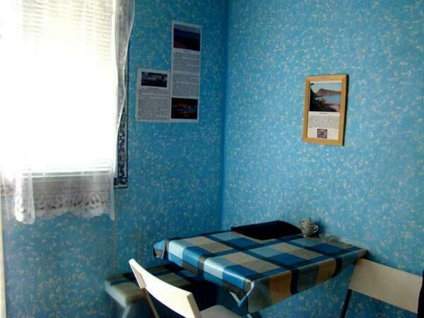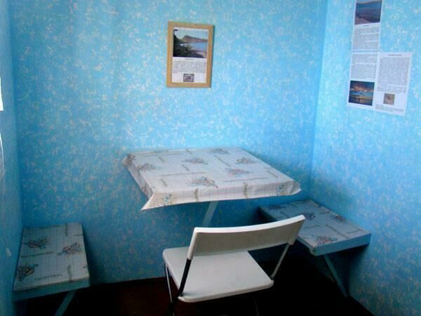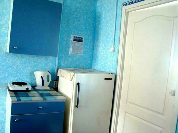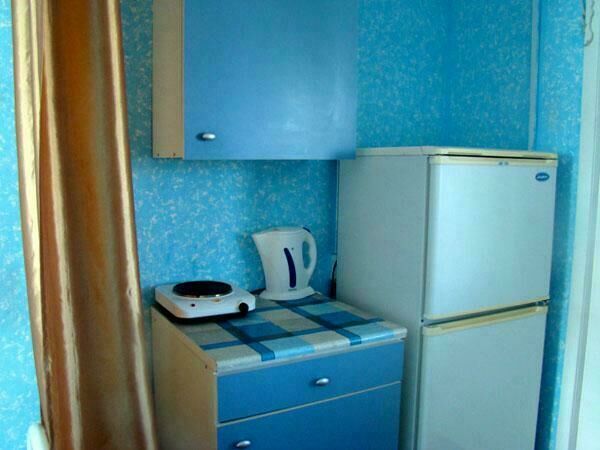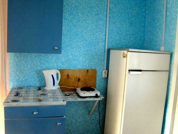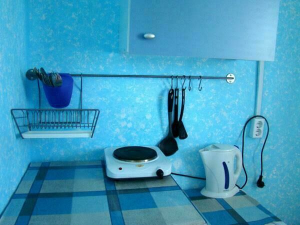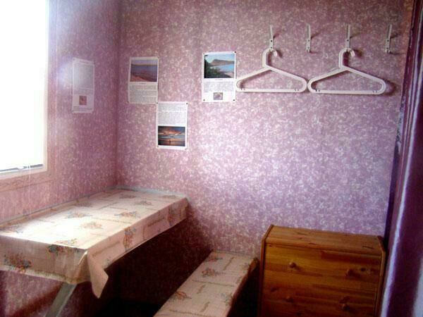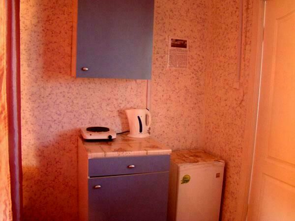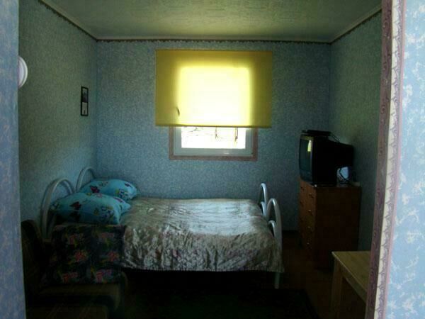 Двухспальная кровать (при необходимости можно поставить дополнительную, односпальную), подушки, одеяла, покрывала, постельное бельё, комод, телевизор с DVD, кресло, стол и 2 стула, крючки с плечиками, кухонные шкафчики, посуда, эл.плитка, эл.чайник, маленький холодильник, собственный санузел — унитаз, раковина, холодное, горячее водоснабжение.