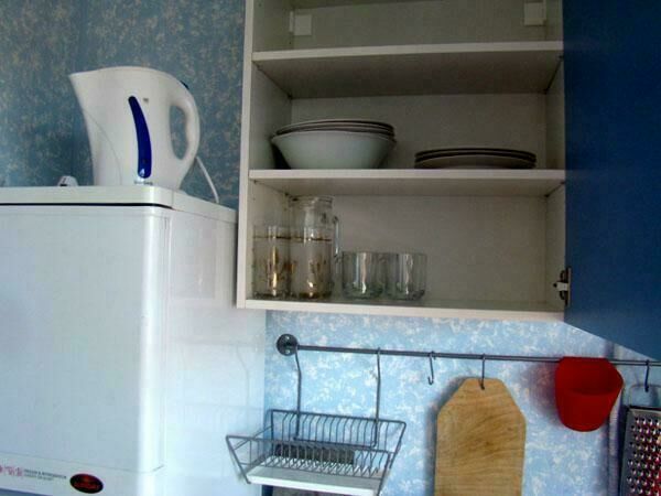 Двухспальная кровать и раскладной диван-книжка, подушки, одеяла, покрывала, постельное бельё, комод, телевизор с DVD, стол и 3 табурета, крючки с плечиками, кухонные шкафчики, посуда, эл.плитка, эл.чайник, большой холодильник, собственный санузел — унитаз, раковина, холодное, горячее водоснабжение.