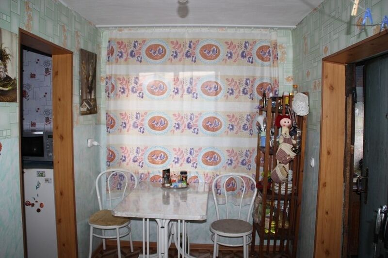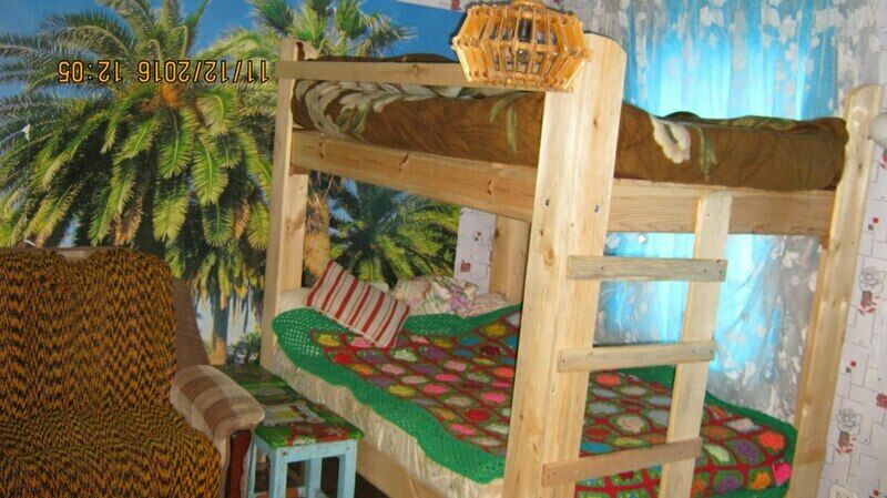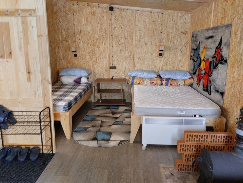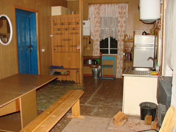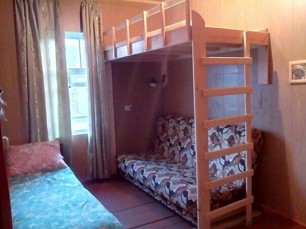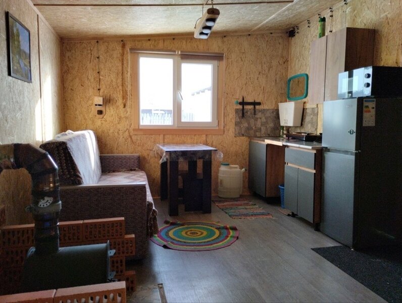 В спальне двуспальная кровать и 2х-ярусная кровать. В кухне раскладной диванчик. Кухня оборудована: холодильником, газовой варочной поверхностью и микроволновкой. Вода в домике: летом — проточная, с началом холодов — приносная.