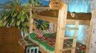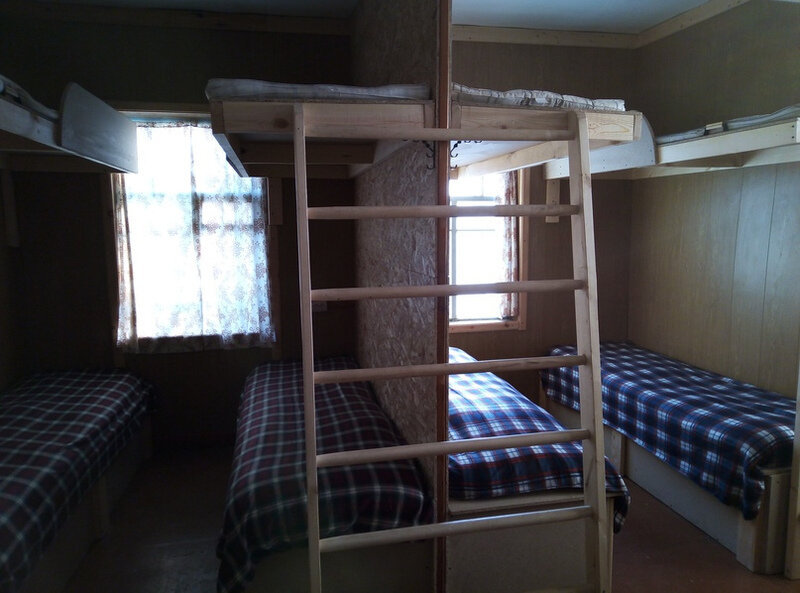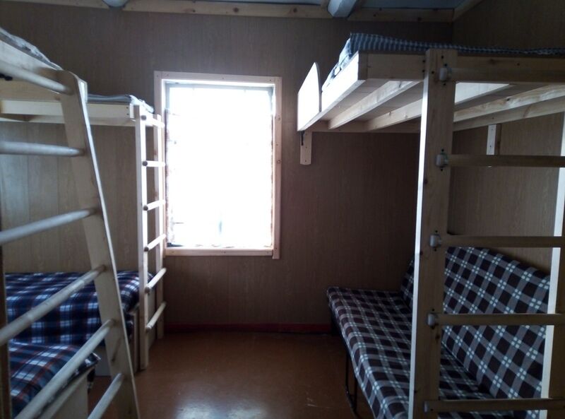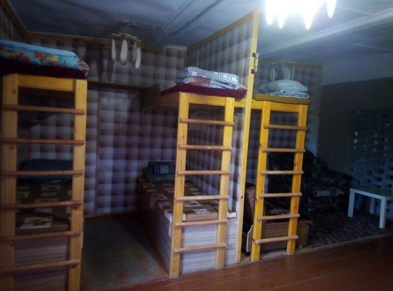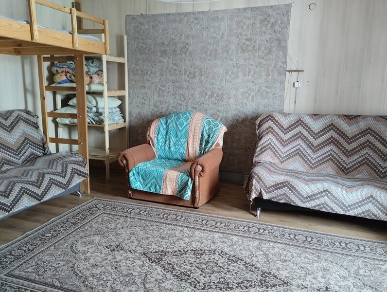 В комнате два плацкарта, диван и кровать/чердак над диваном. Туалет на улице.