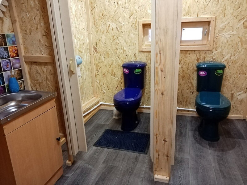 В домике есть просторная кухня-столовая. Туалетная комната на две кабинки в доме.