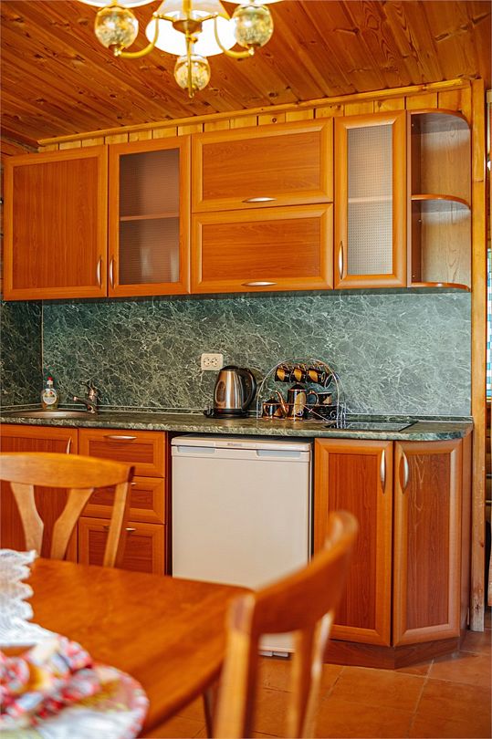 На первом этаже находится компактная, но функциональная кухня, оборудованная всем необходимым: холодильником, электрической плитой, чайником и посудой. Здесь же расположены удобный совмещенный санузел с душем и отдельная туалетная комната.