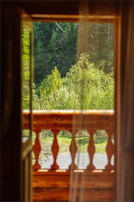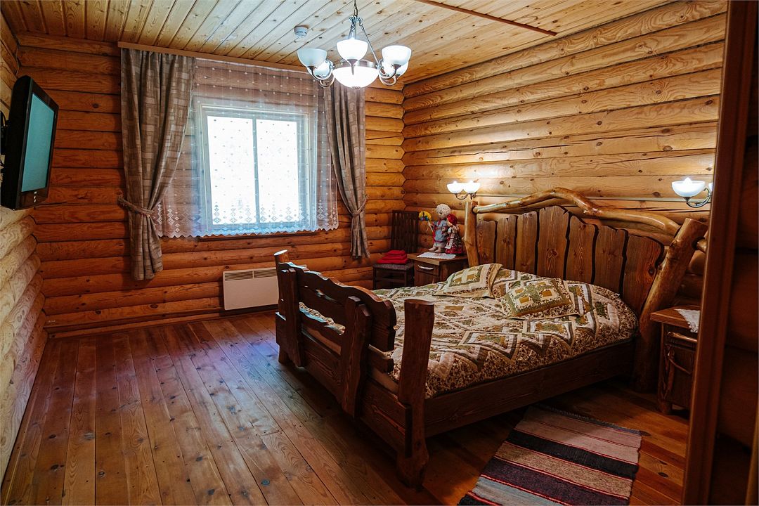 На втором этаже находится комфортабельная спальня с двуспальной кроватью, телевизором и выходом на балкон, с которого открываются великолепные виды на окружающую природу. В спальне также есть прикроватные тумбочки и вешалки для одежды.