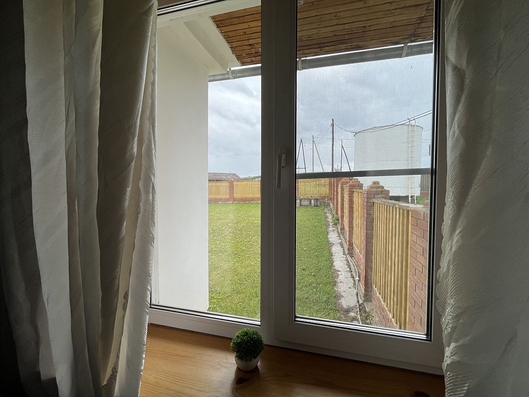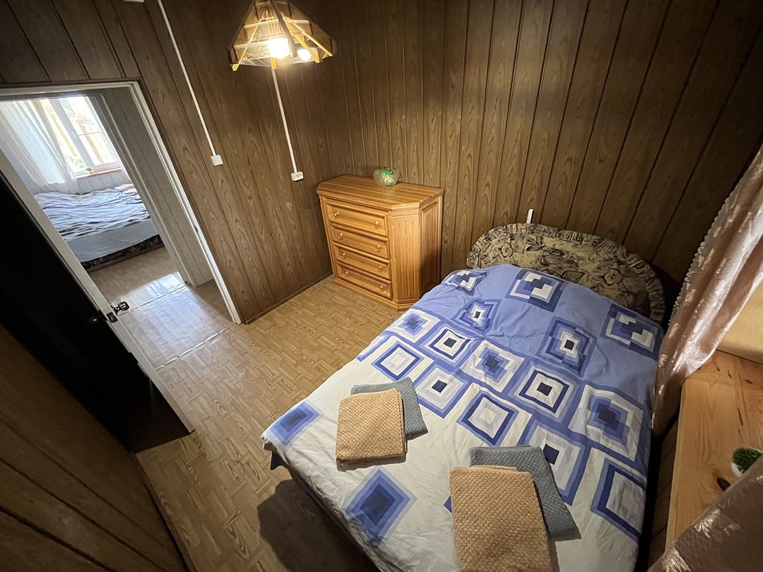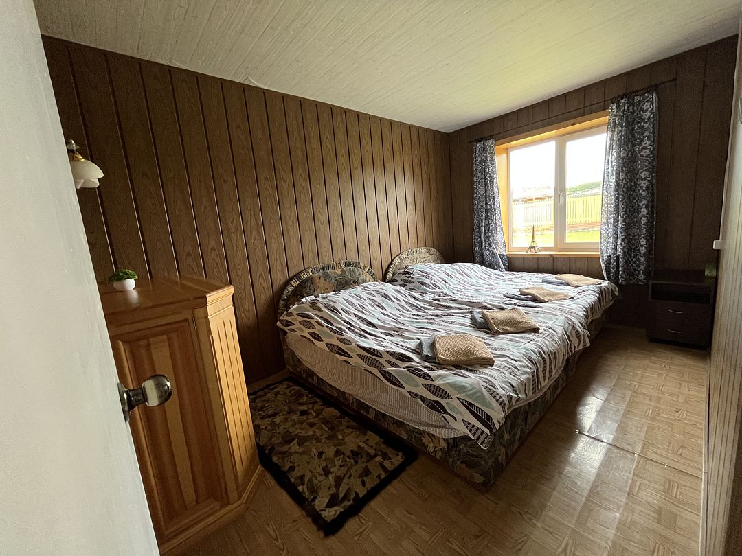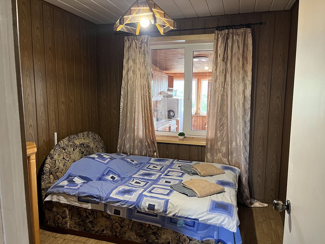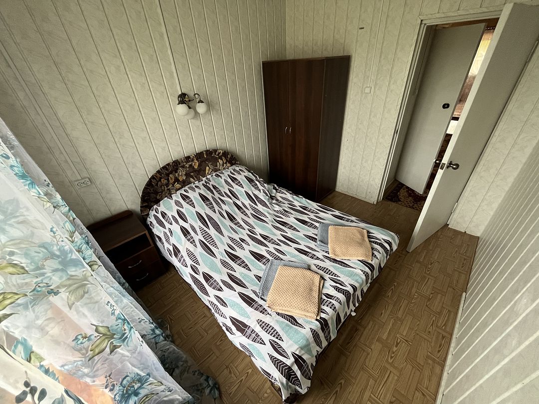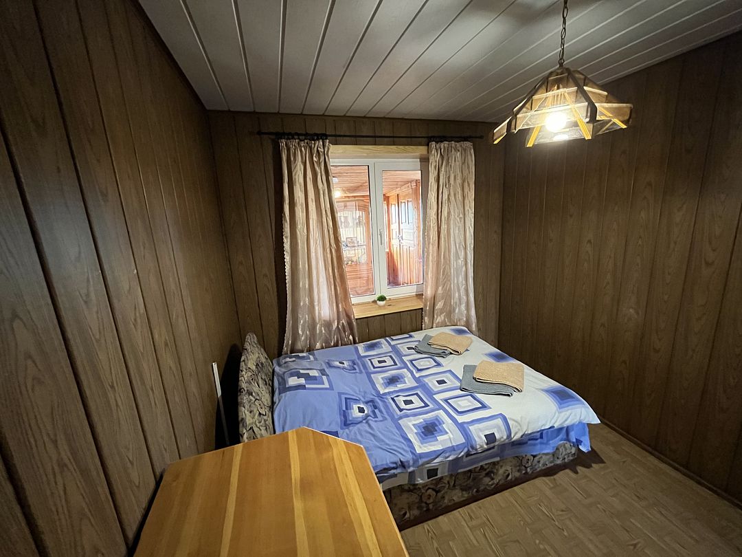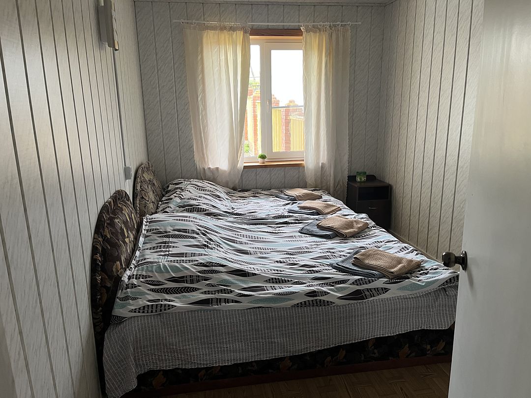 В номере находится одна двуспальная кровать. Рядом с номером расположен туалет и душевая. Окно на внутреннюю часть дома (кухня, гостиная)
