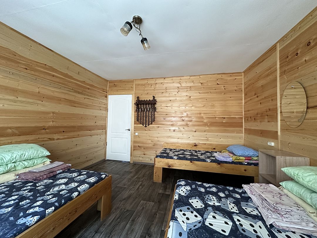 Комната отдыха с кухней, 3 спальни, баня, беседка с большим столом на улице, туалет (унитаз).