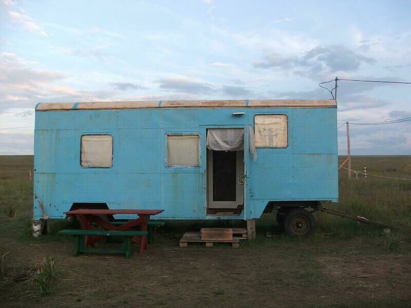 Вагончик с электричеством состоит из двух комнат: спальня и кухня. В жилой комнате имеется четыре спальных места, напоминающие спальные места в поезде. В кухне имеется небольшой столик с лавочками, электроплита, полочки для посуды. На улице возле дома стоит стол с двумя лавочками.