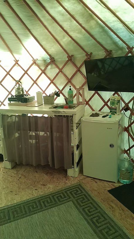 НедостаткиОтсутствует микроволновка и эл.чайник. Не хватает места в шкафчике. Девочкам некуда будет поставить бутылочки с кремами и косметику, нет тумбочкии,маленькие зеркала. Беседка не защищена москитной сеткой. Туалет это отдельное помещение, находится вне юрты. В шаговой доступности, но если на улице дождь можно промокнуть.