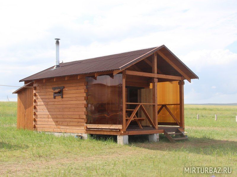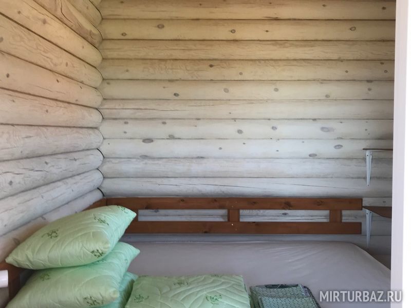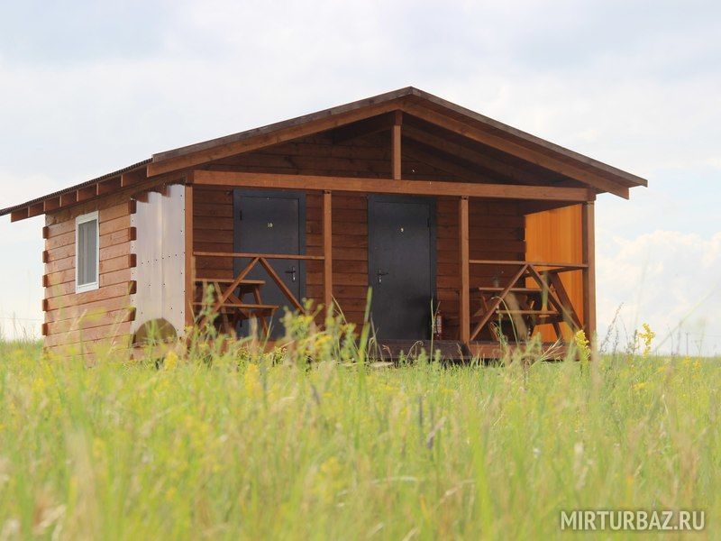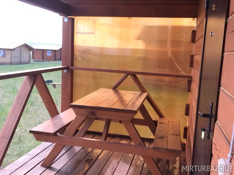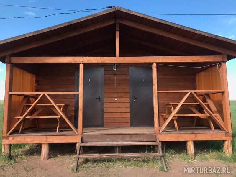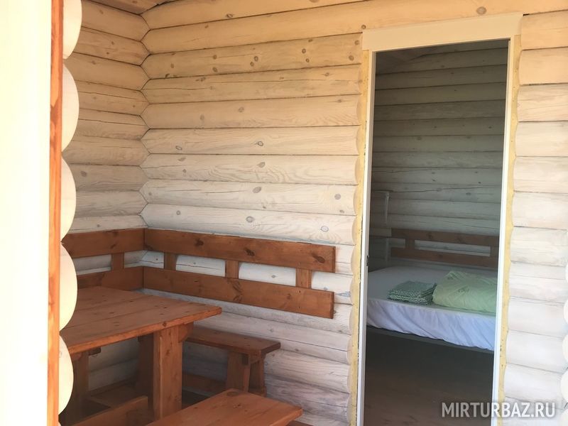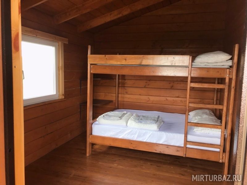 Дом представляет из себя строение состоящее из двух одинаковых номеров c общей террасой. Каждый номер имеет отдельный вход и рассчитан максимум на 4 взрослых и 2 детей до 12 лет. Во всех номерах располагается двухспальная двухъярусная кровать, холодильник, также на террасе расположен обеденный стол для каждого номера. Всего таких домов на территории базы пять.