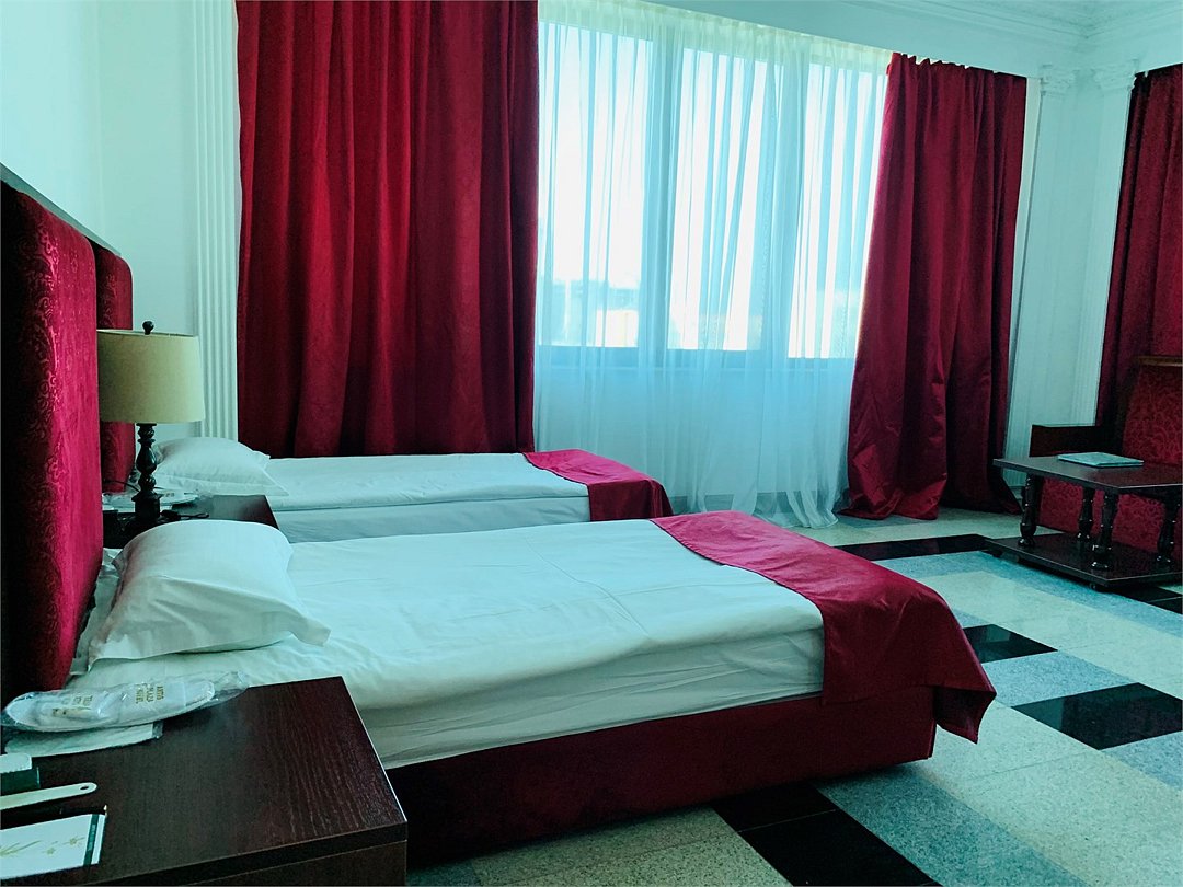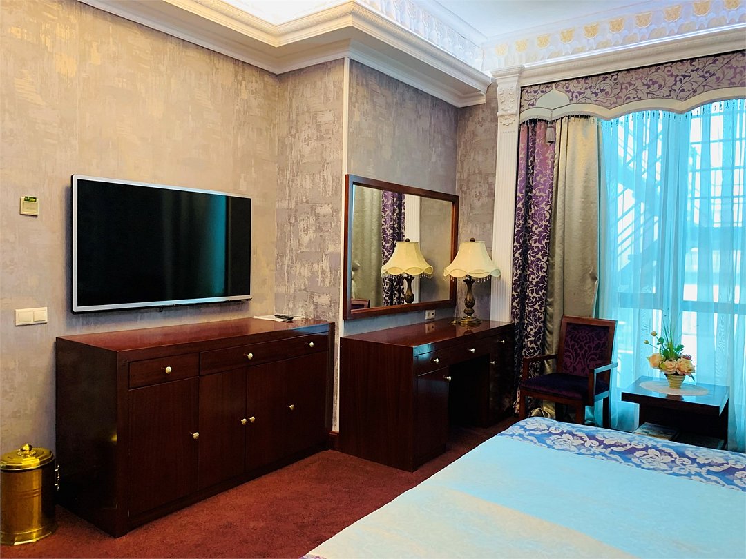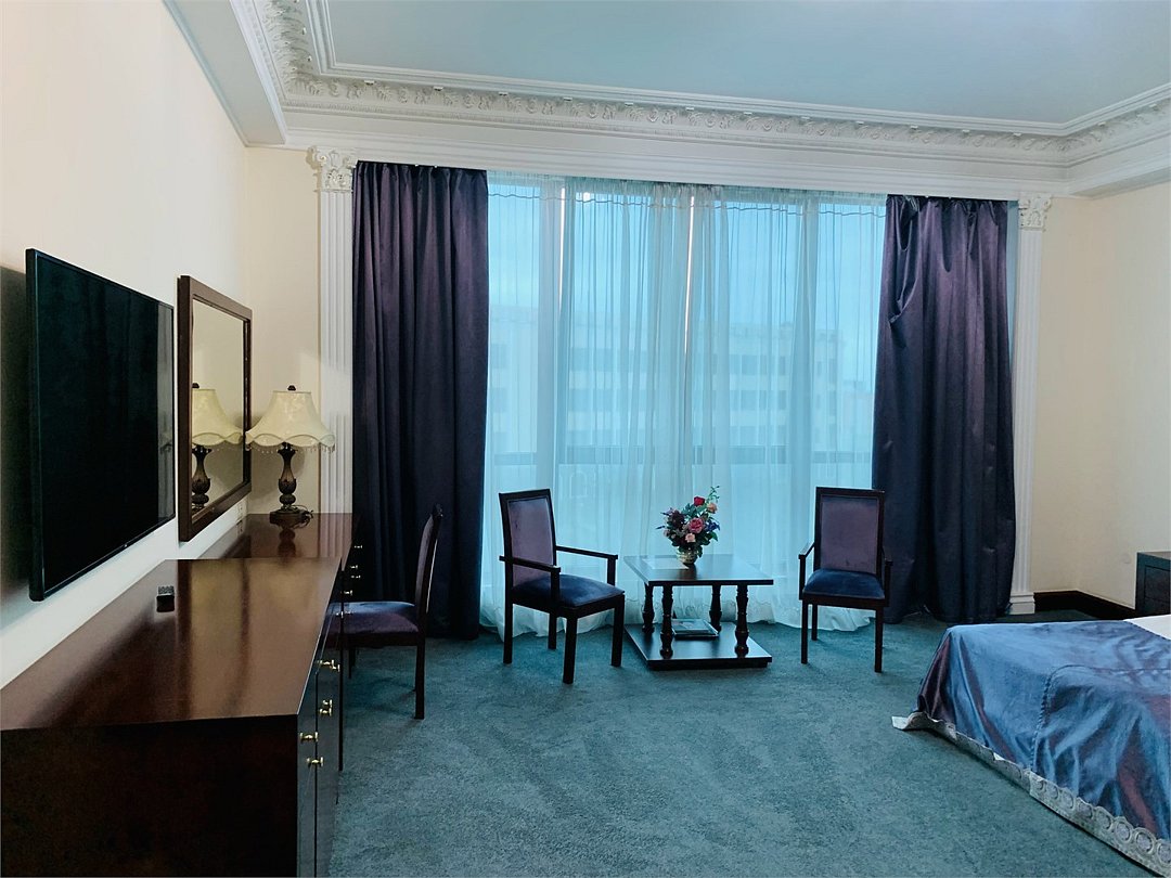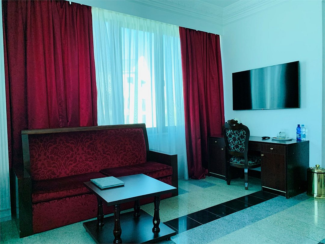 телевизор, спутниковое телевидение, кабельное телевидение, Wi-Fi, кондиционер, фен, банные принадлежности, халаты, банные полотенца, тапочки, гигиенические средства, косметические средства, двуспальная кровать, две односпальные кровати, диван, стулья, журнальный столик, зеркало, чайный набор, унитаз, раковина, питьевая вода, душ, вид на город, вид во двор, стол, туалетный столик, туалетные средства, внутренний телефон, мини-холодильник, гигиенический душВ гостиничном номере