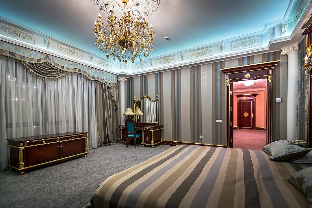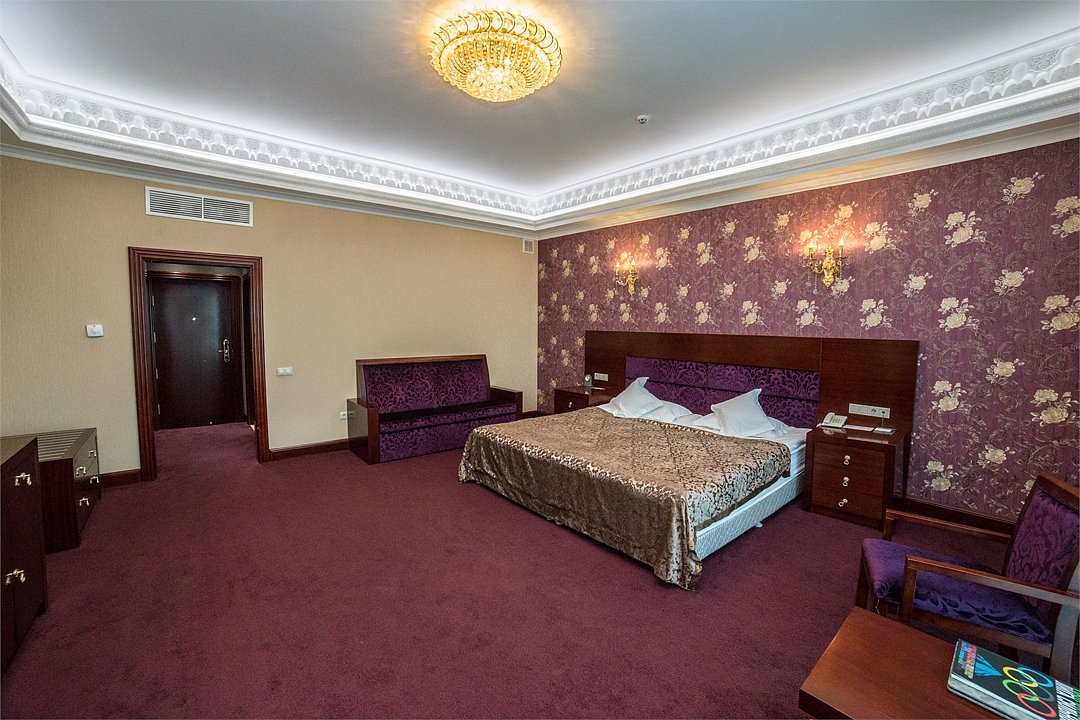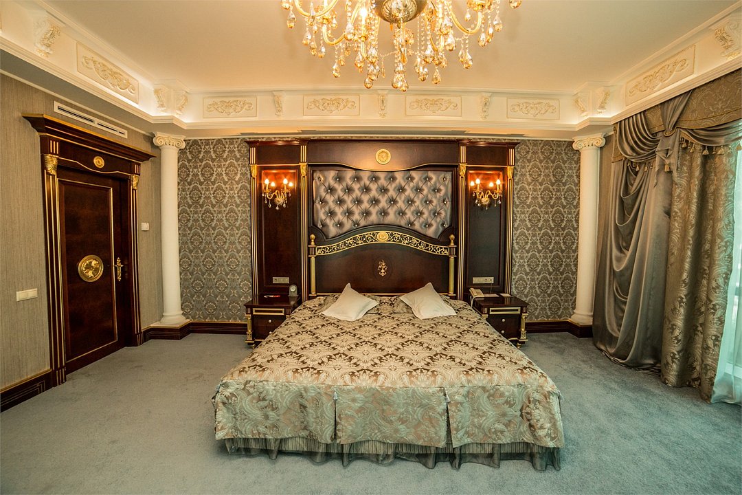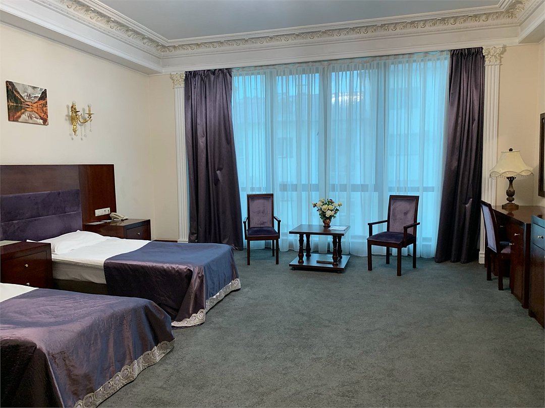 Однокомнатный номер с одной двуспальной или двумя односпальными кроватями предназначен для комфортного проживания одного или двух человек. Завтрак по системе "Шведский стол" включен в стоимость проживания.Президентский Люкс