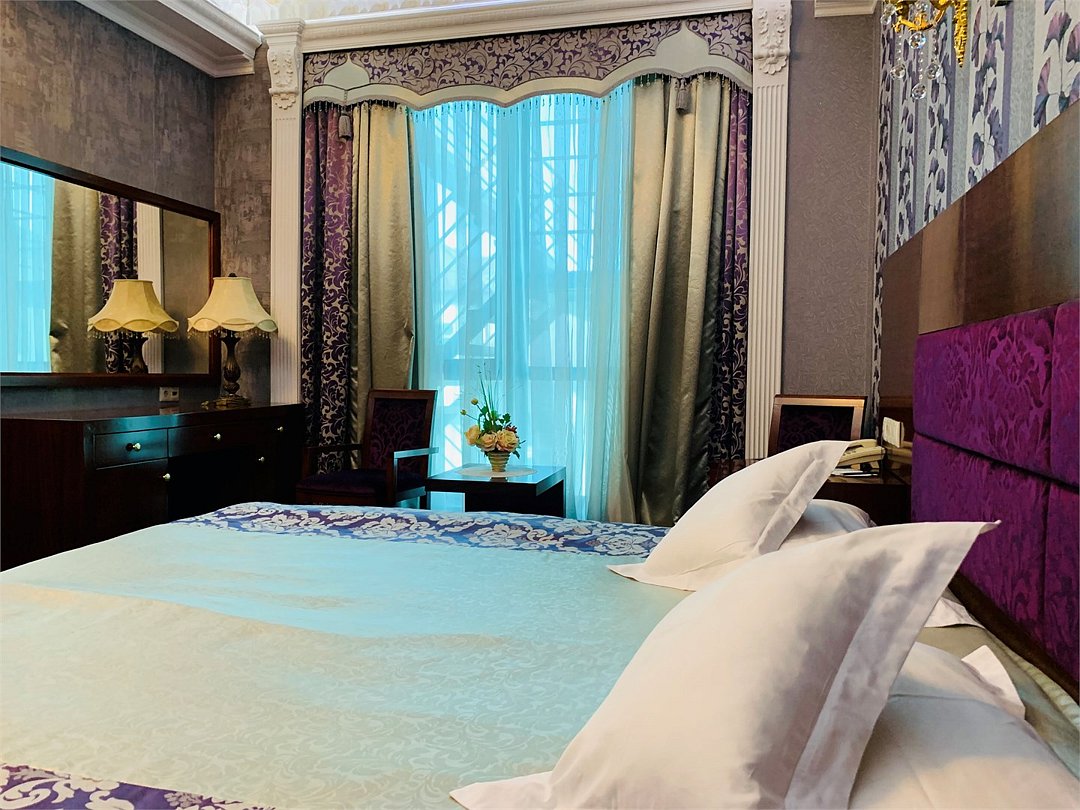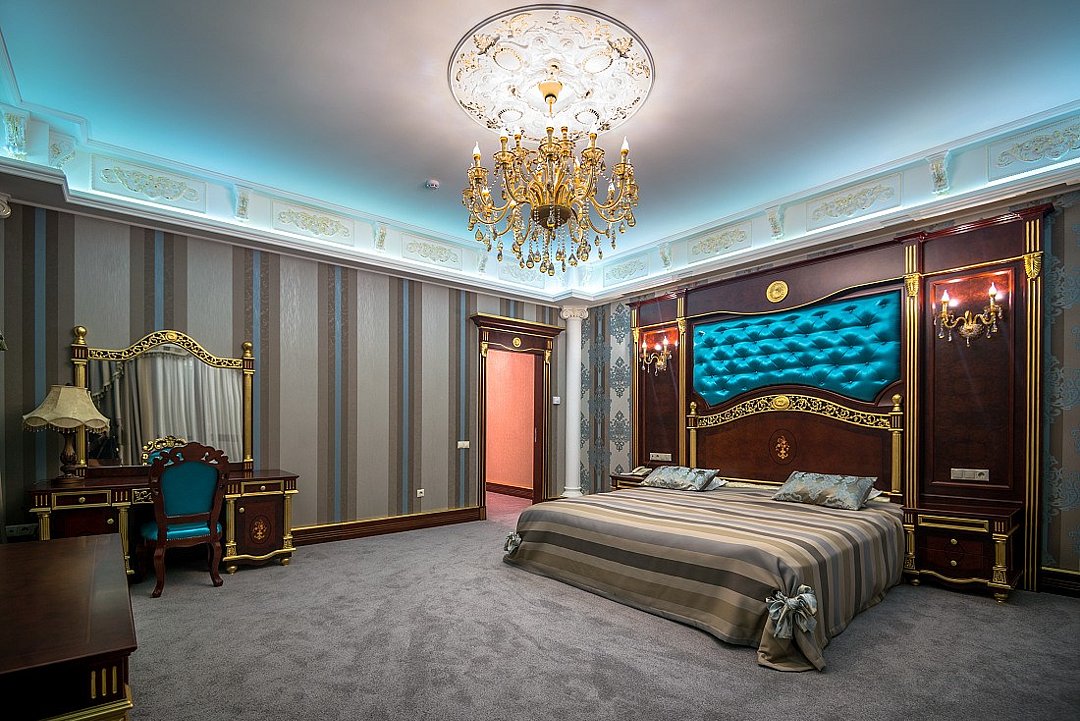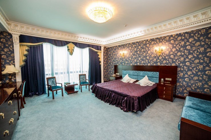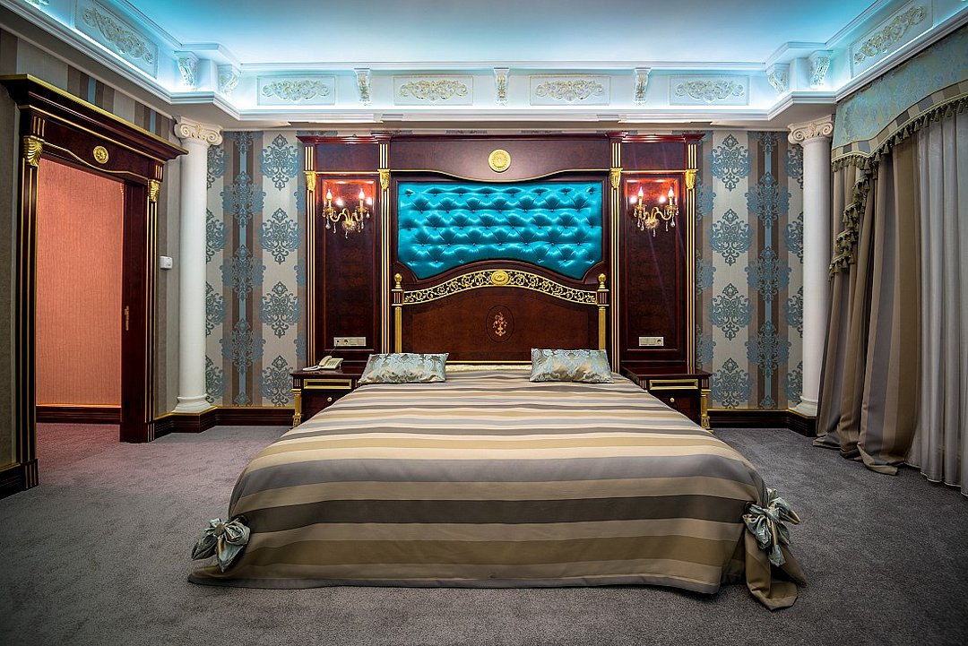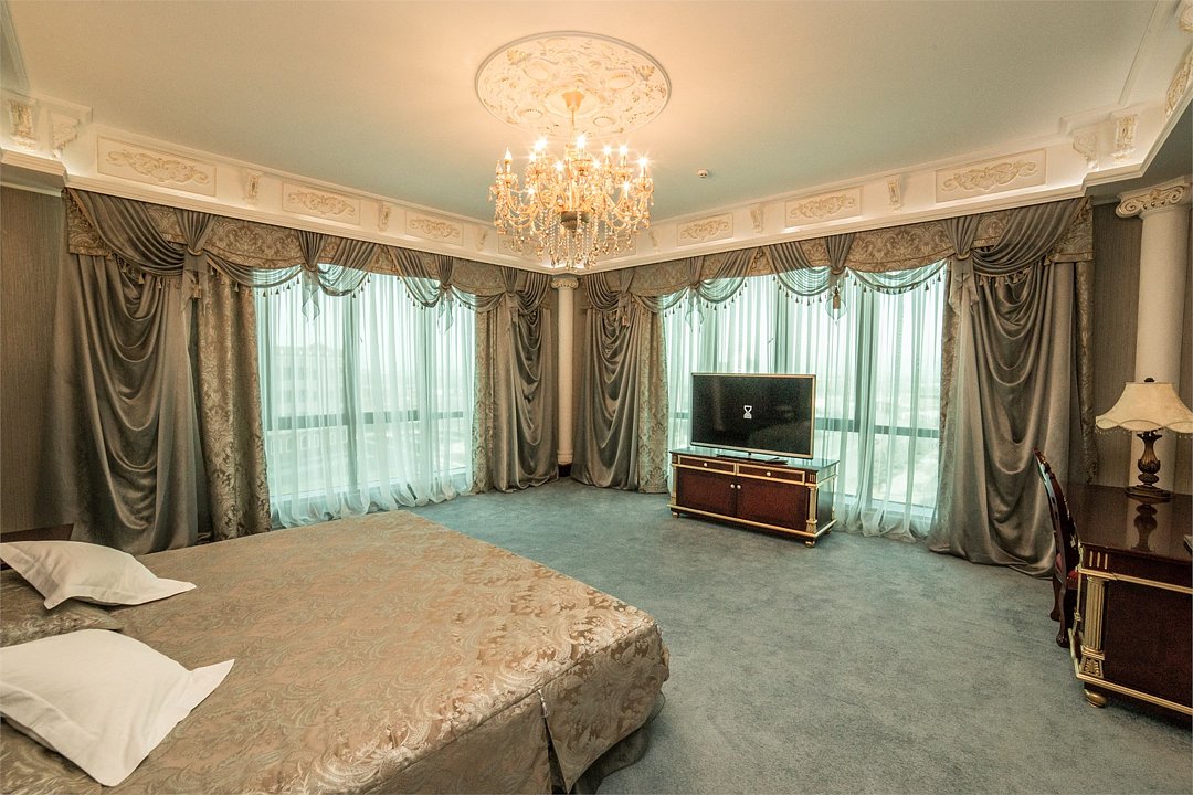 Однокомнатный номер с одной двуспальной или двумя односпальными кроватями предназначен для комфортного проживания одного или двух человек. Завтрак по системе "Шведский стол" включен в стоимость проживания.Президентский Люкс