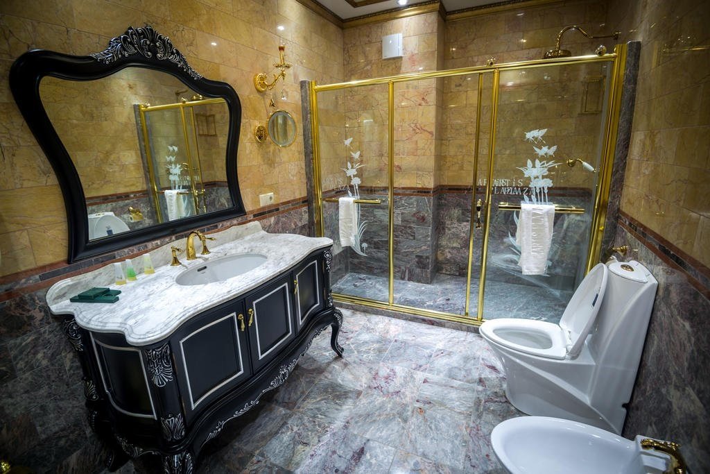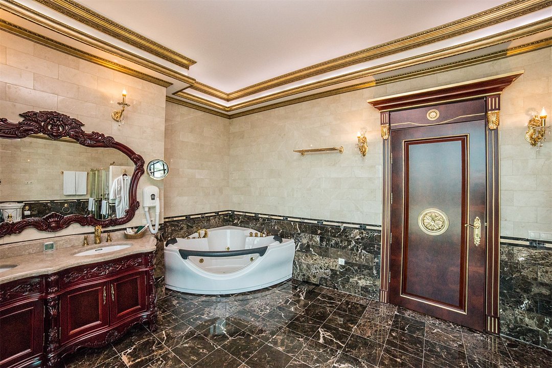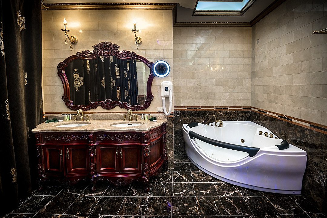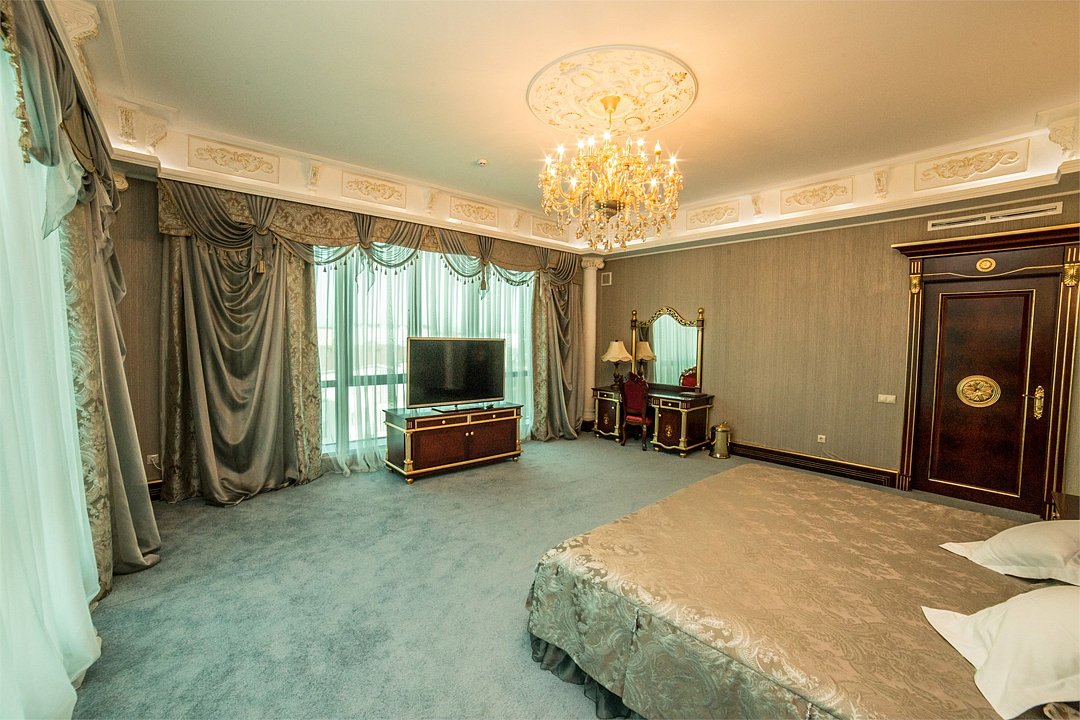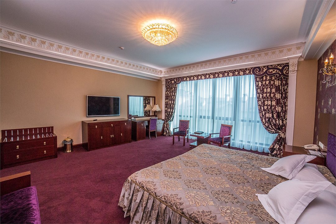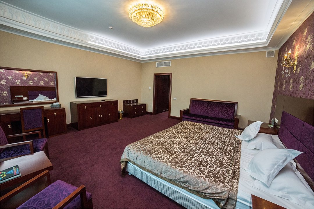 два телевизора, Wi-Fi, кондиционер, система климат-контроля, светильник, настольные лампы, фен, электронные замки, душевая кабина, биде, халаты, тапочки, косметические средства, двуспальная кровать, гардеробная, вешалки, журнальный столик, стол для переговоров, зеркало, комод, две комнаты, мини-бар, минеральная вода, унитаз, мягкая мебель, питьевая вода, вид на город, вид во двор, туалетные средства, туалет, цифровое тв, внутренний телефон, мини-холодильник, гигиенический душ, джакузи, чайная станцияВ гостиничном номере