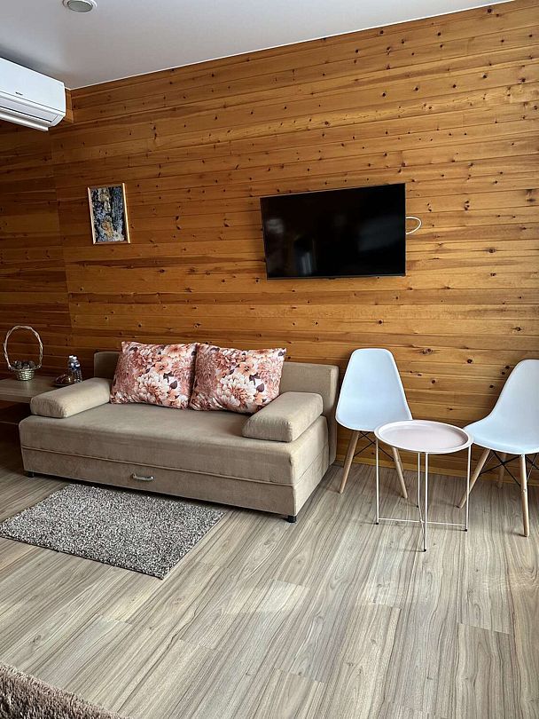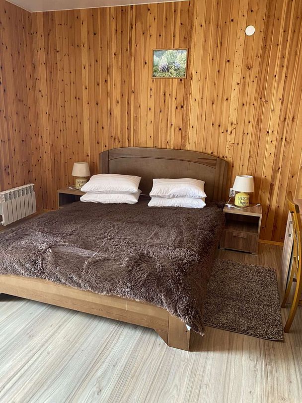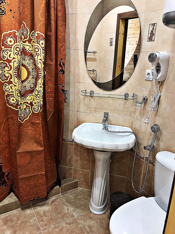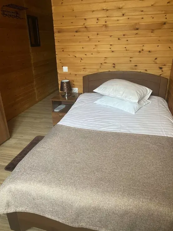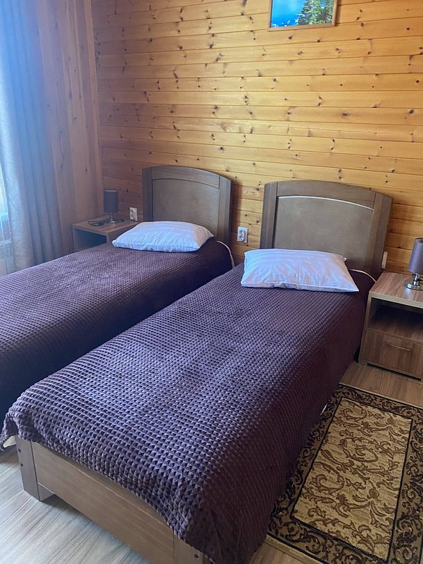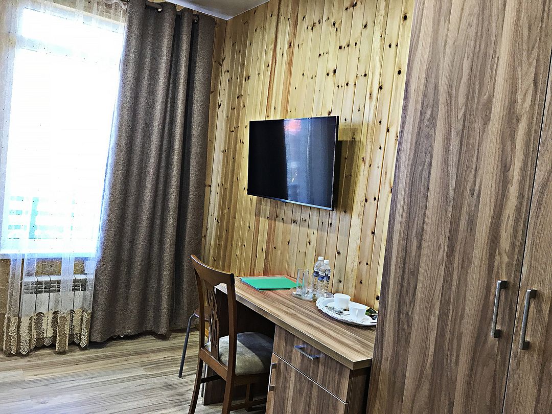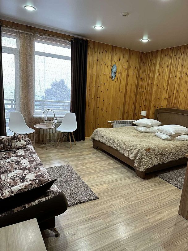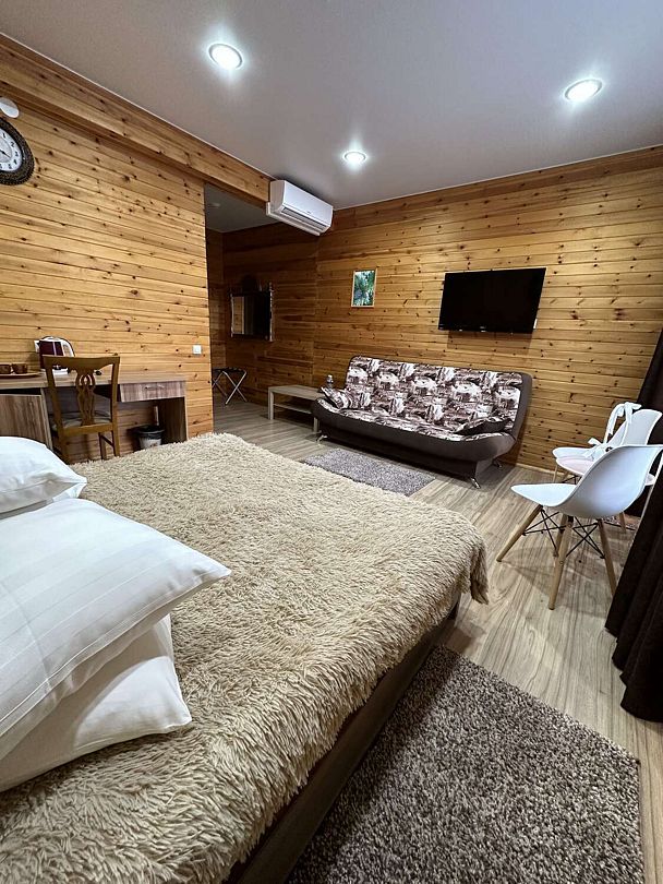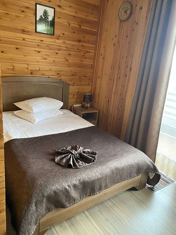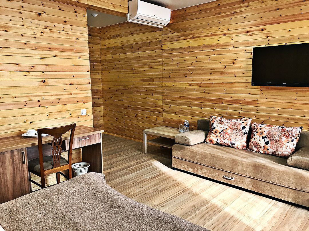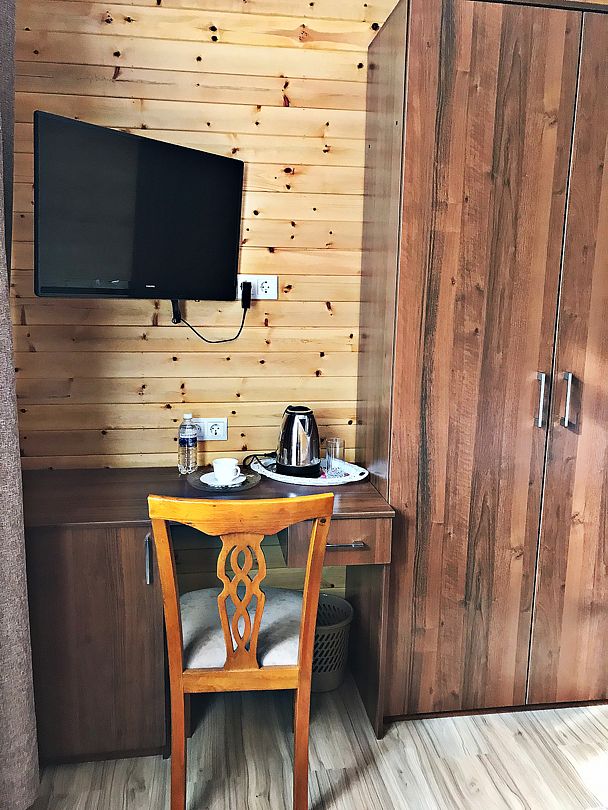 В номерах все, что нужно (даже в пятерках не всегда это бывает) - халаты, тапочки, холодильник, чайник с принадлежностями. Очень чистый и приятный, всё отделано кедром и пахнет деревом!