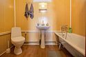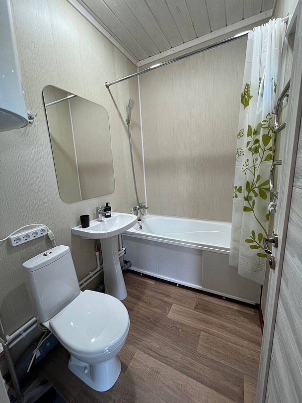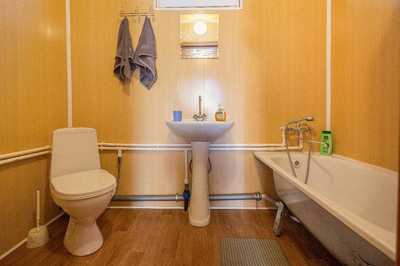 Полноценная ванна, унитаз, раковина, зеркало, полотенцесушитель. В комплекте — мыло, шампунь, гель для душа. Терраса обустроена для отдыха на свежем воздухе — столом, лавками и шезлонгом. Здесь особенно приятно встречать рассветы над озером.
