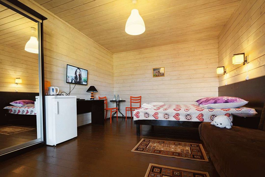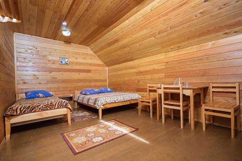Номера категории «Бюджет» находятся в уютных двухэтажных домиках, где внутренняя отделка выполнена из натуральной сибирской сосны.