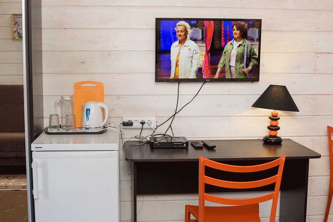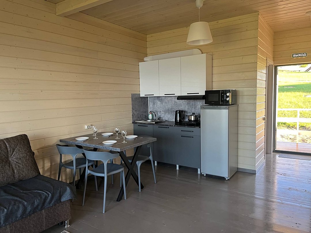 Мини-кухня оборудована всем необходимым: холодильником, индукционной плитой, микроволновкой, чайником, вытяжкой и посудой. Вы можете сами готовить еду или воспользоваться питанием на базе отдыха.