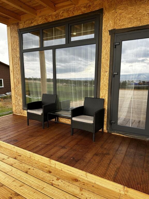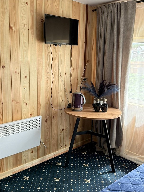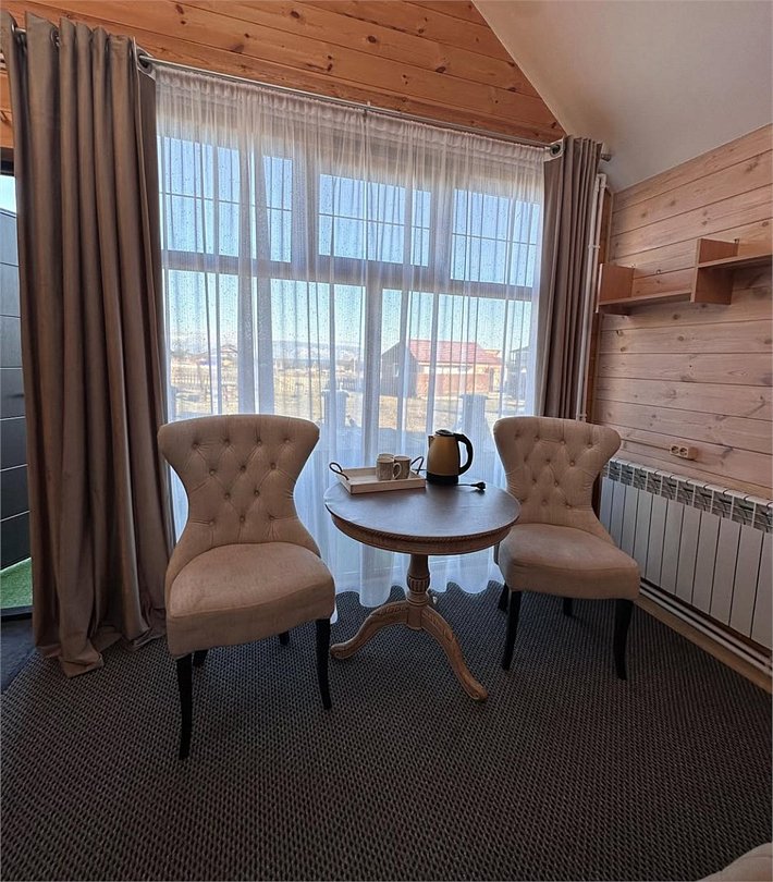 Wi-Fi, обогреватель, терраса, двуспальная кровать, две односпальные кровати, стулья, вешалки, зеркало, звуконепроницаемые стены и окна, чайник, отопление, вид на море, вид во двор, ламинат, стул, стол, тумба, панорамные окна, телевизор с плоским экраном, балкон с боковым видом на море, вешалки-плечики, затемняющая штора, окна от пола до потолка, можно с питомцамиВ домике