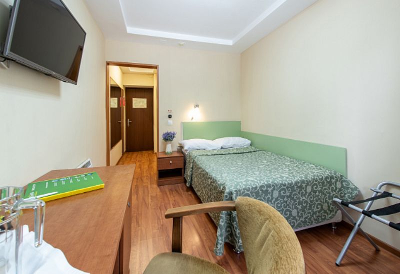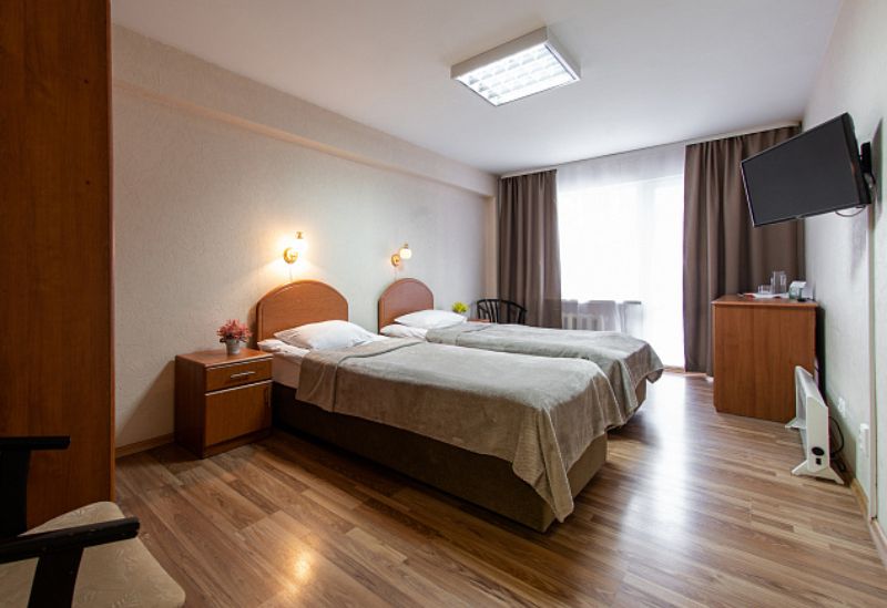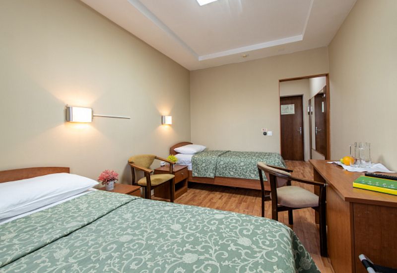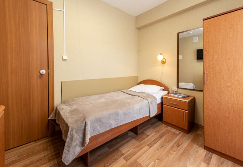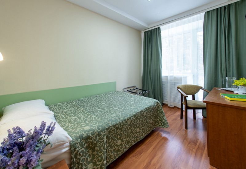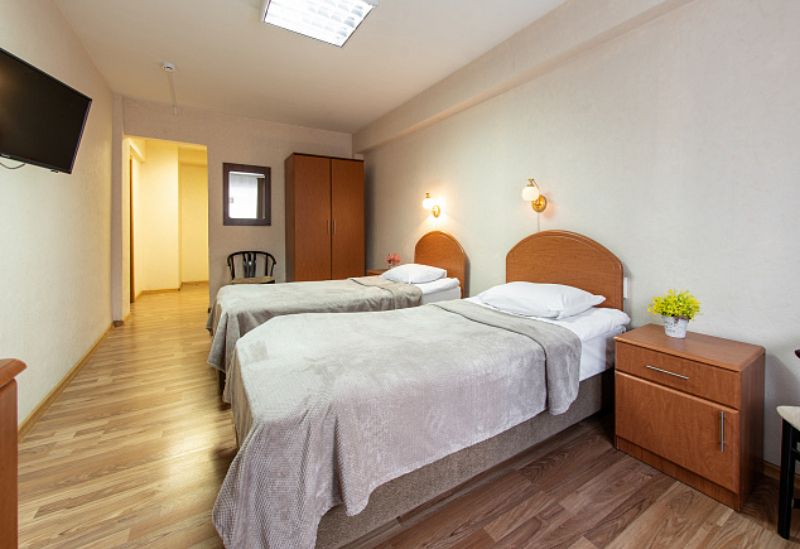 В прихожей: зеркало, встроенный шкаф. В комнате: две односпальные кровати, стол, две прикроватные тумбы, два стула, телевизор, холодильник, дополнительные подушка и одеяло. В ванной комнате: душевая кабина, предметы индивидуального пользования, комплект полотенец, полотенце для медицинских процедур/пляжное, халат для медицинских процедур. Wi-Fi. Гладильная, кулер с холодной/горячей водой на этаже.