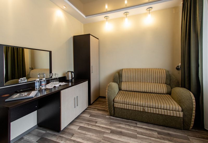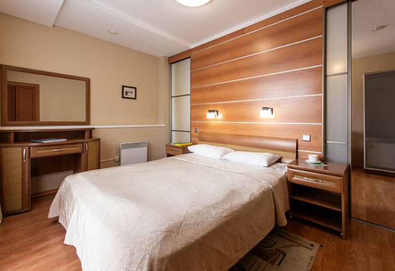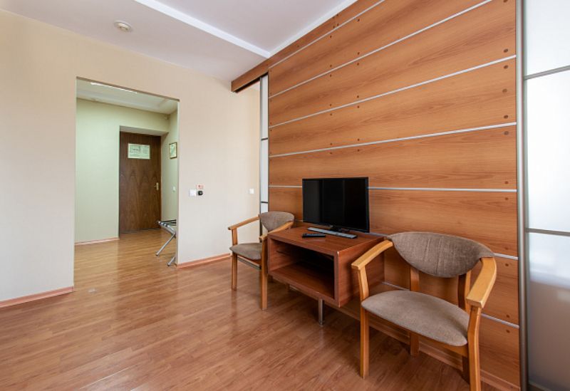 В прихожей: вешалка. 2 спальные комнаты. В первой – две односпальные кровати, две прикроватных тумбочки, стол, два стула, шкаф, телевизор, холодильник, зеркало, два комплекта полотенец, две простыни для медицинских процедур. Во второй – кровать, прикроватная тумбочка, стол, шкаф, стул, холодильник, телевизор. Светильник, система безопасности, гипоаллергенное белье, кресло. В ванной комнате: душевая кабина, туалетные принадлежности (мыло, шампунь, гель для душа). Один сан. узел на два номера. Дополнительное место для детей 3 – 7 лет.