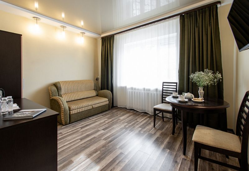 В прихожей: шкаф-купе. В гостиной: ЖК-телевизор, эл. чайник, холодильник, стол, три стула, диван (3-е спальное место) В спальне: ЖК-телевизор, шкаф, 2-спальная кровать (есть номера с двумя односпальными кроватями), две прикроватных тумбочки, два комплекта полотенец, два халата, две простыни для медицинских процедур. В ванной комнате: душевая кабина, туалетные принадлежности (шампунь, гель для душа, мыло), фен. Дополнительное место для детей 3 – 7 лет.