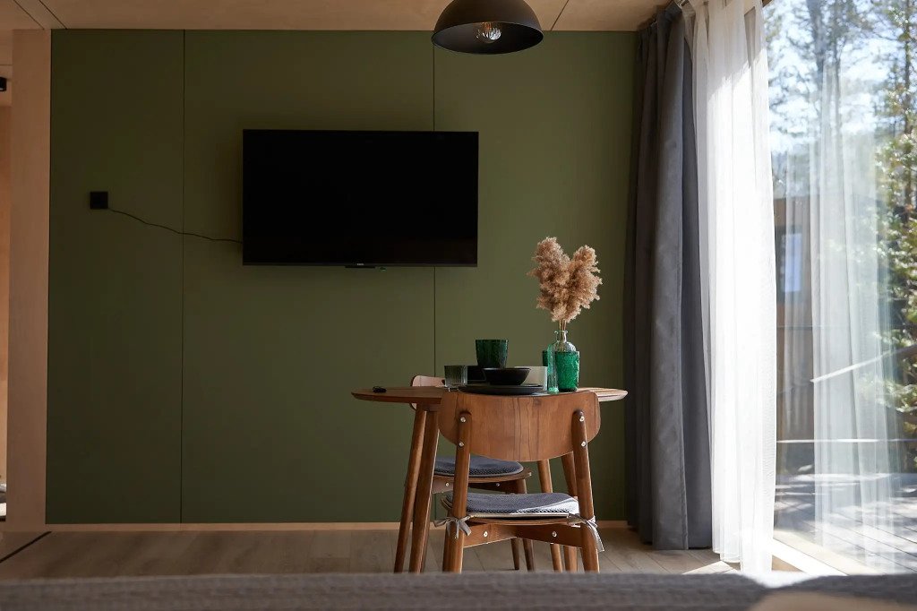 В номере вы найдёте телевизор. Оснащение зависит от выбранной категории номера.