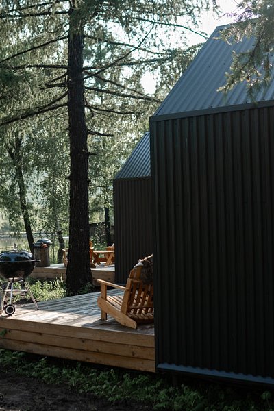 У каждого домика есть собственная терраса, оборудованная местами для комфортного времяпровождения. Именно с нее открывается прекрасный вид на горы, реку и небольшое озеро.