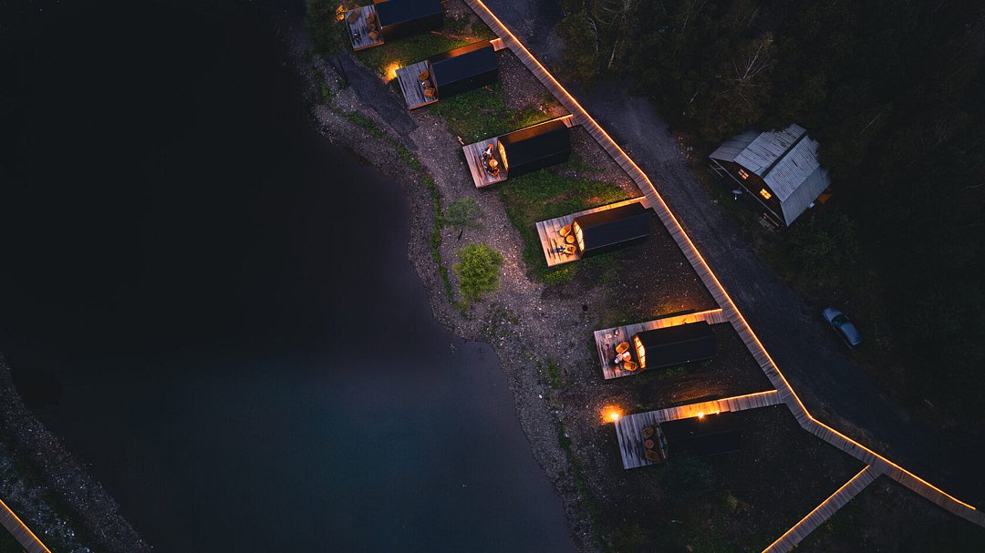 Есть необходимые туалетные принадлежности, полотенца, фен. Панорамные окна в каждом домике дарят возможность любоваться прекрасным видом на реку и горы, не выходя наружу.