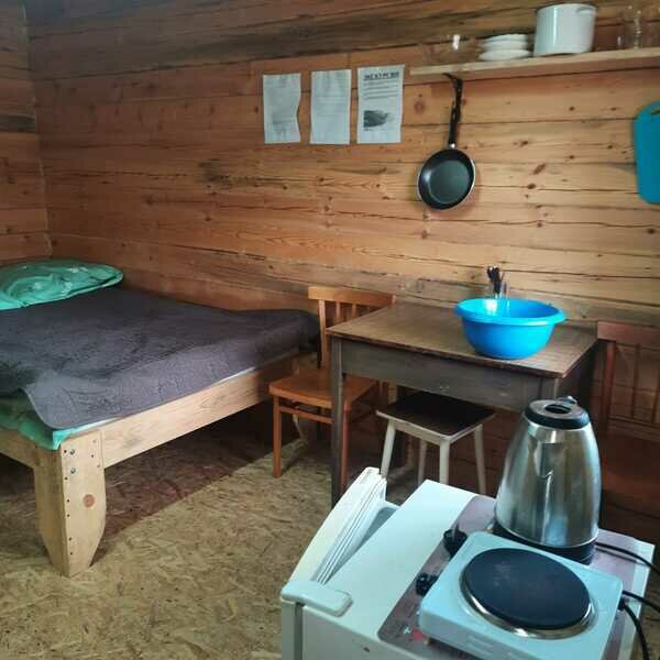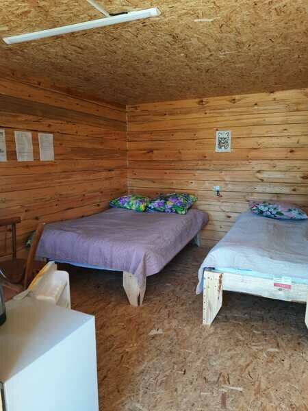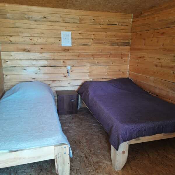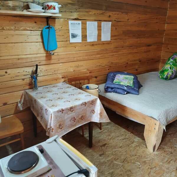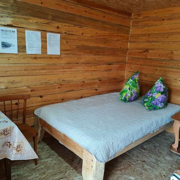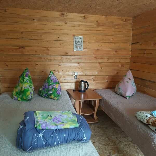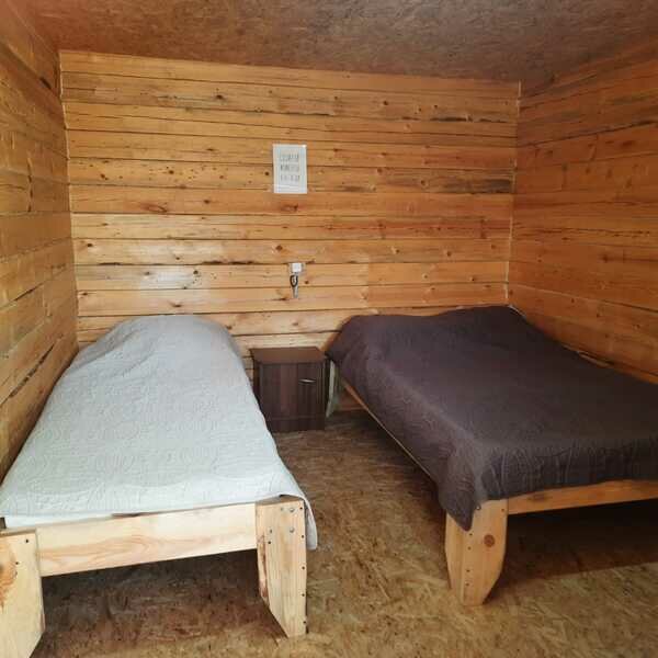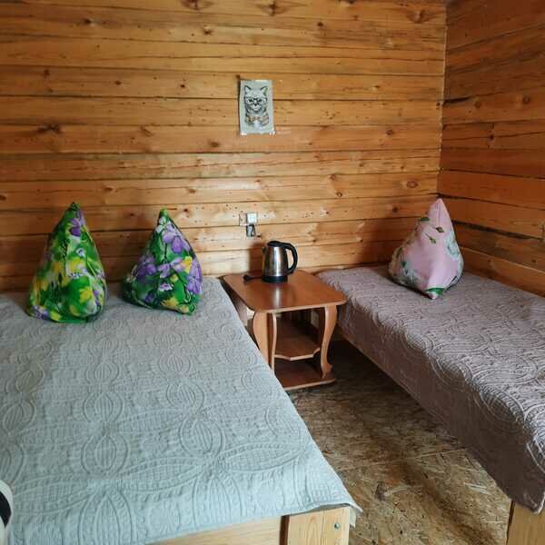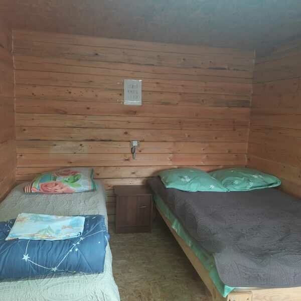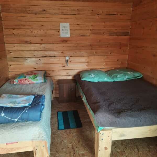 Номер на первом этаже двухэтажного деревяного коттеджа. В номере имеется: двухспальная кровать, односпальная кровать, холодильник, электрическая плита, чайник, набор посуды.