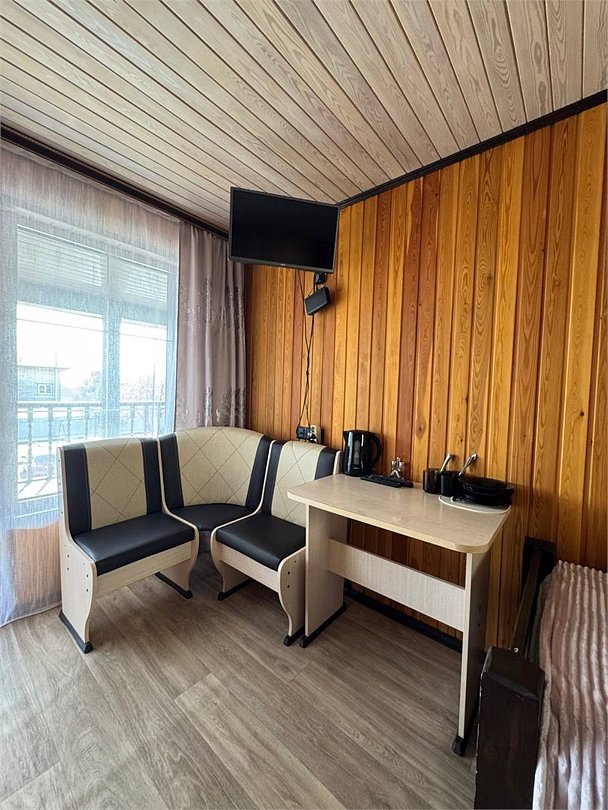 Комната 55 кв.м. В четырёхместном номере предоставляется: •одна двухспальная кровать, два двухместных диван •кухонные приборы (холодильник, чайник, микроволновка, плита, телевизор(ТВ 250каналов), посуда на 4 человека •4 комплекта постельного белья •4 полотенца •санузел в комнате •в номере есть террасаУслуги и удобства