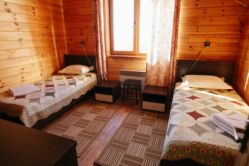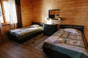 На втором этаже коттеджей расположены 3 номера: 2 номера с раздельными кроватями и 1 номер с двуспальной кроватью (этот номер больше по площади). Все номера на втором этаже комфортные (душ, туалет в номере).
