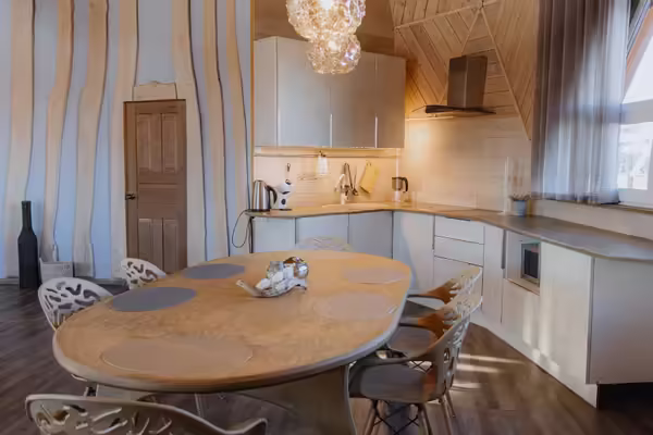 В доме два этажа, на первом просторная гостиная с двумя большими диванами, камином и пространством для занятий йогой. В кухонной зоне большой обеденный стол и всё необходимое оборудование, включая варочную панель, чайник, капсульную кофе-машину, блендер. В шкафах достаточно посуды для приготовления и сервировки ваших любимых блюд. На первом этаже также находится просторная ванная комната со стиральной машиной для вашего удобства.