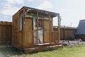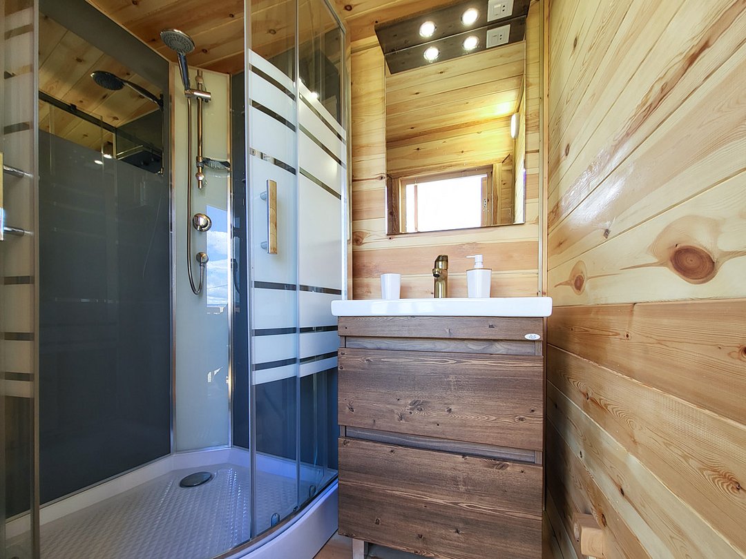 Электричество и светильники, кровать из массива с ортопедическим матрасом, простынь с подогревом, тепловая пушка, постельное белье высокого качества, деревянная мебель ручной работы, вешалка и полки для одежды, стол и стулья, чайник с посудой, два шезлонга на террасе.