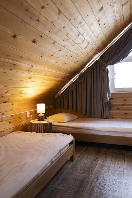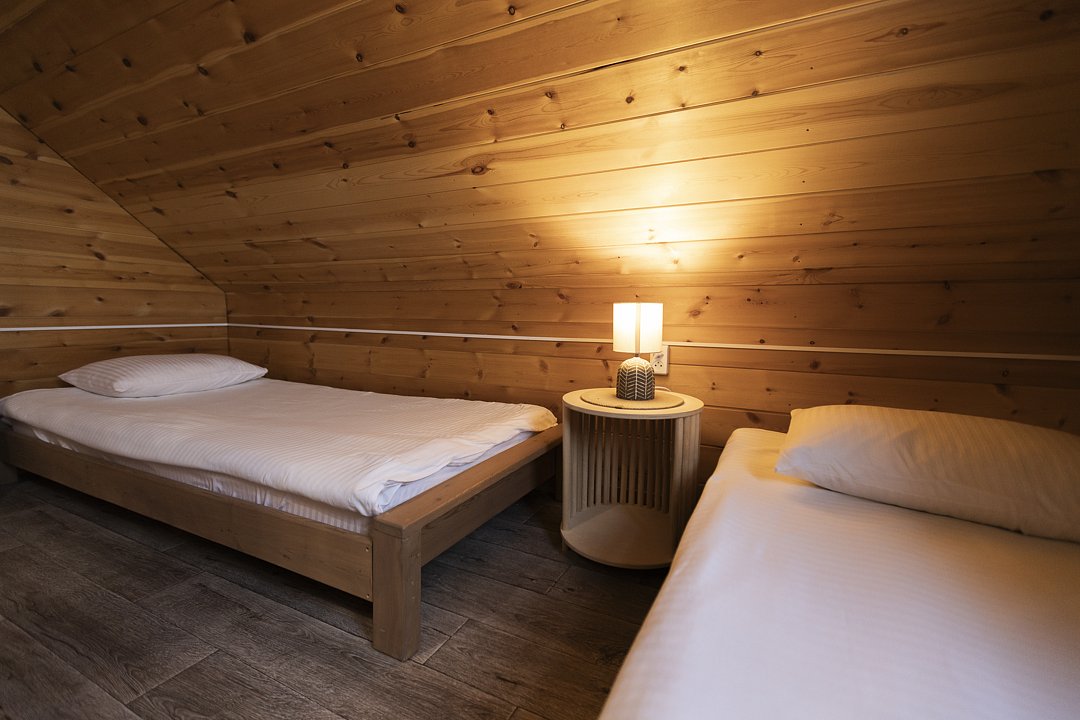 На втором этаже располагаются две уютные спальни. В одной из них находится двуспальная кровать, а в другой – две односпальные кровати. Вы сможете выбрать удобный вариант размещения в зависимости от ваших предпочтений.