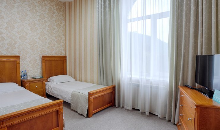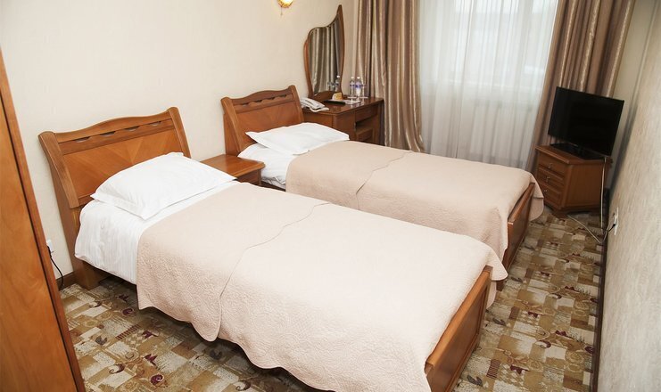 Интерьер оформлен в пастельных тонах, на полу — ковровое покрытие высокого качества. Мебель из натурального дерева порадует удобством и красотой. В каждом номере есть две односпальные кровати, плательный шкаф, прикроватная тумба, комод, зеркало, полноценная ванная комната, кондиционер, трюмо с зеркалом.